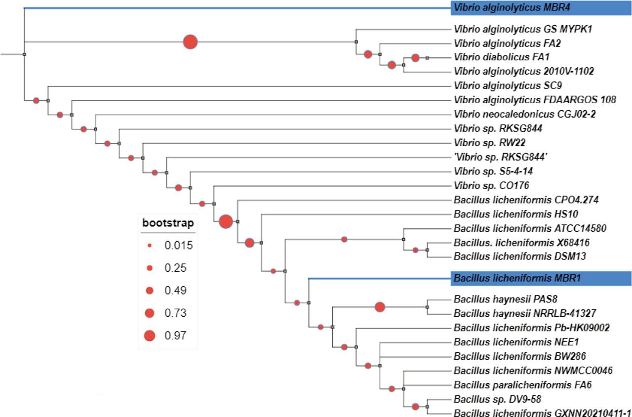 After the bacteria were screened using the agar overlay assay, one bacterium each was selected from soft coral and macroalgae. Based on its morphologic features and a comparison with the closest strain from the NCBI database, MBR1 had close similarity with more than 15 strains of Bacillus licheniformis and 99.72% with the type strain B. licheniformis ATCC 14580T. MBR4 had similarity with Vibrio alginolyticus and a similarity of 99.91% and recorded the highest BLAST score with the type strain V. alginolyticus NBRC 15630T. These strains MBR1 (from soft coral) and MBR4 (from macroalga) were identified as Bacillus licheniformis MBR1 (NCBI: OP379261) and Vibrio alginolyticus MBR4 (NCBI: OP379262), respectively. A phylogenetic tree showing the strains and other related organisms is presented in Figure 1.