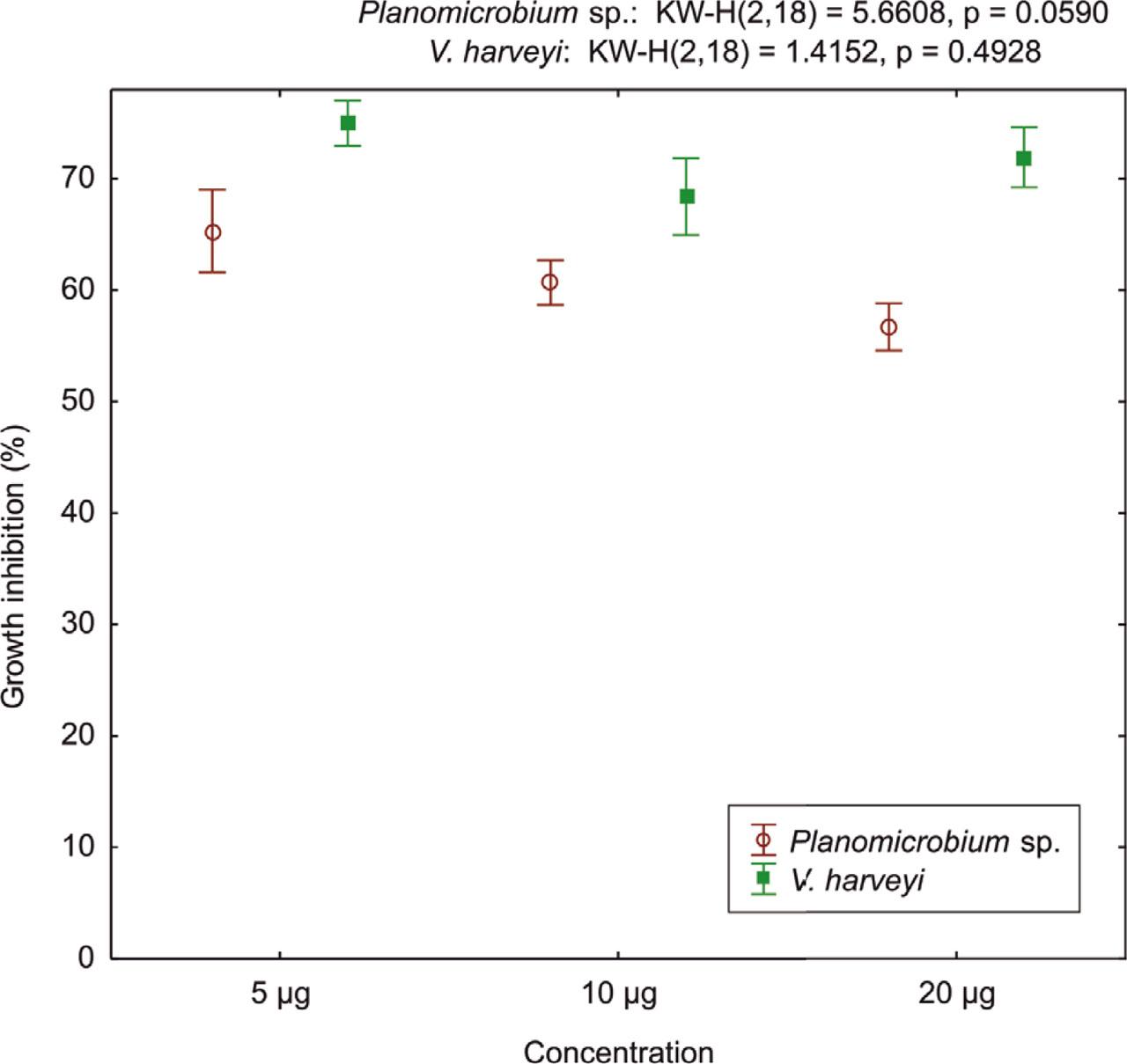 The CSE from the two bacterial strains inhibited the planktonic growth of the biofilm-forming bacteria V. harveyi and Planomicrobium sp. The CSE extracted from MBR1 exhibited strong inhibitory activity against V. harveyi (Figure 2), whereas the CSE of MBR4 strongly inhibited the planktonic growth of both V. harveyi and Planomicrobium sp. (Figure 3). Among the concentrations of the CSE tested, no significant differences were observed in growth inhibiting activity.
