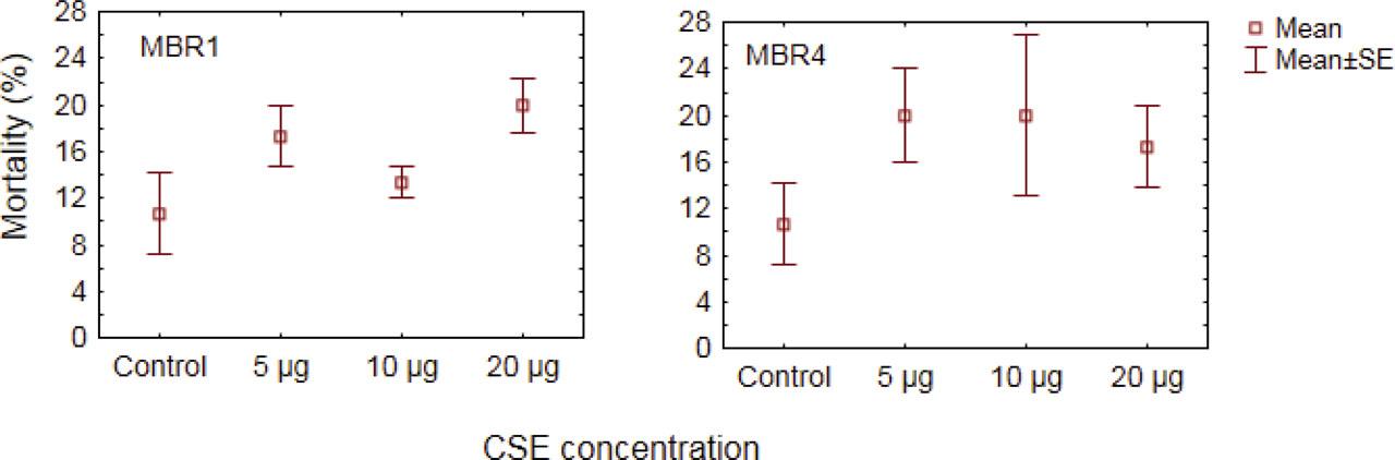 The CSE treatment did not show much effect on the survival of the nauplius larvae during the 96-h toxicity study (Figure 5). The two-way ANOVA results also confirmed the weak toxicity of the extracts against barnacle larvae, as evidenced by the insignificant variation (F=2.32; df=3,24; p=0.1) in mortality between the concentrations of the extracts.