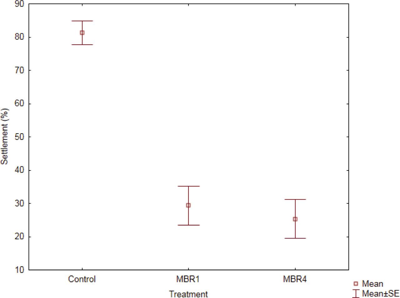 The results indicated reduced settlement of cypris larvae on the 6-well plates due to CSE treatment. The CSE of strain MBR4 exhibited higher settlement inhibition than the extract of MBR1 (Figure 6). The one-way ANOVA results indicated a significant variation in cyprid settlement between the control and CSE treatment groups (F=25.86; df=3,8; p<0.05). Further, the post hoc Tukey test revealed that settlement of larvae in the wells with CSE was reduced significantly in comparison with the control (Table 1).