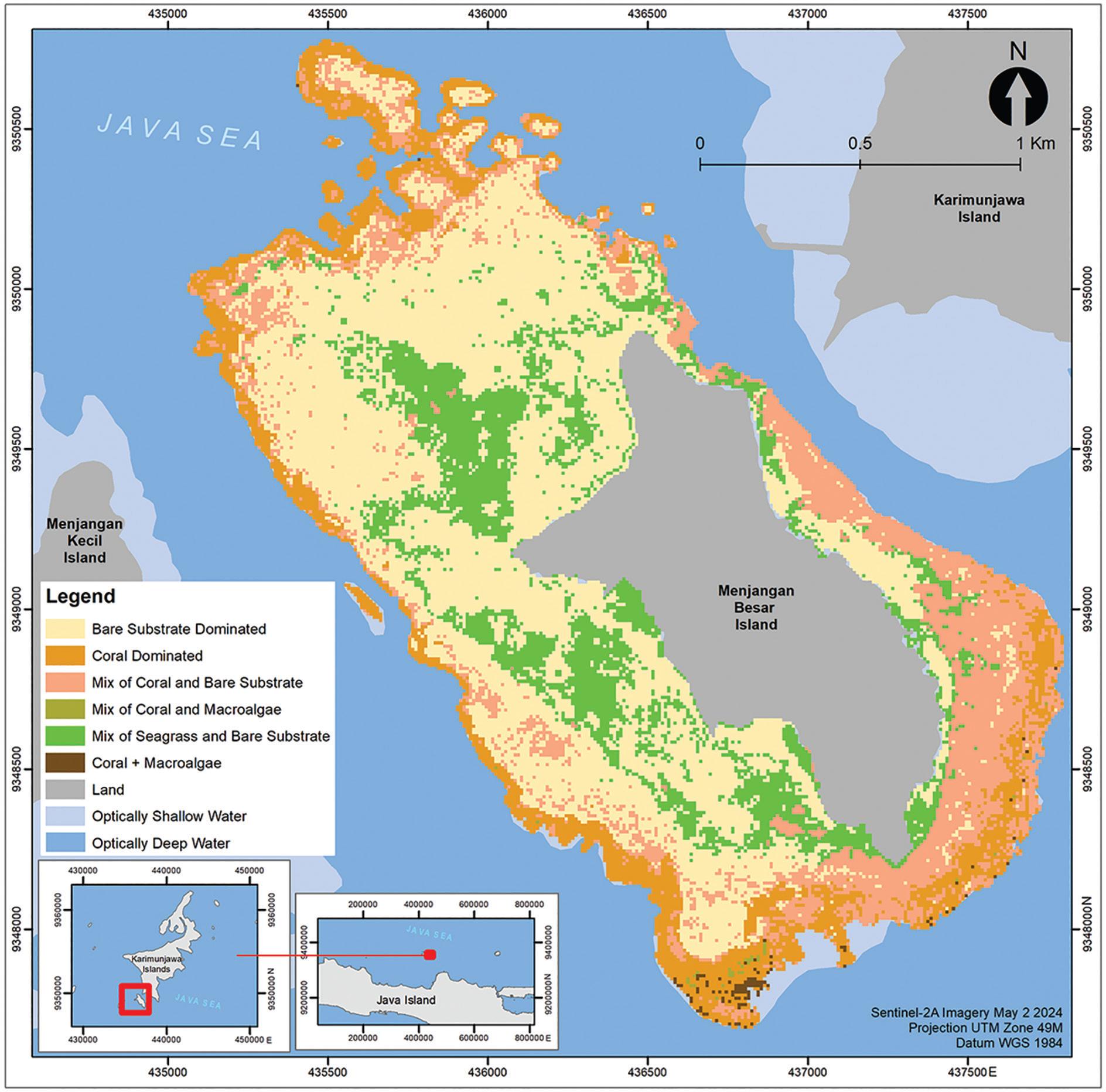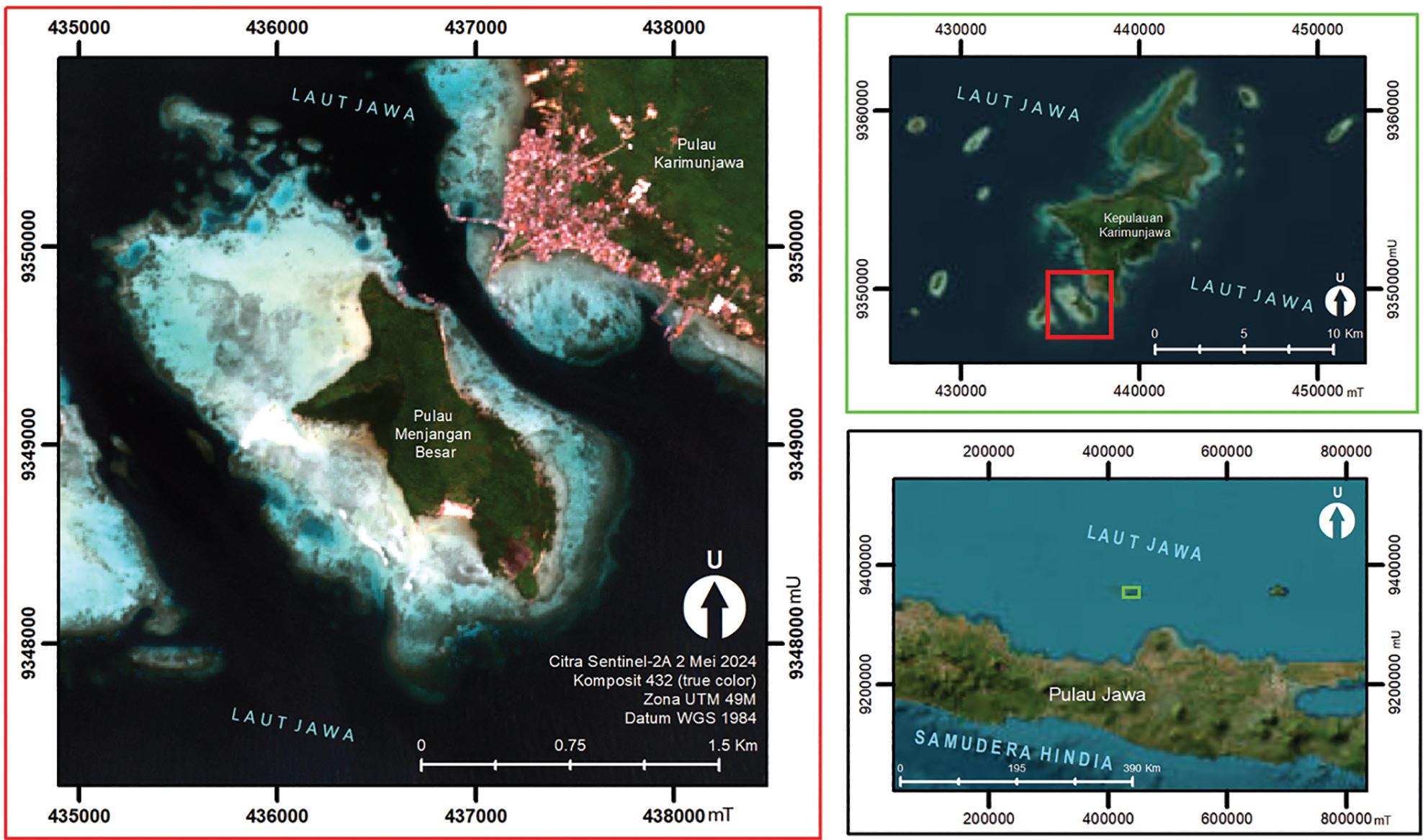 Menjangan Besar Island, Karimunjawa Islands (True colour composite of Sentinel-2A imagery background acquired on 2 May 2024).