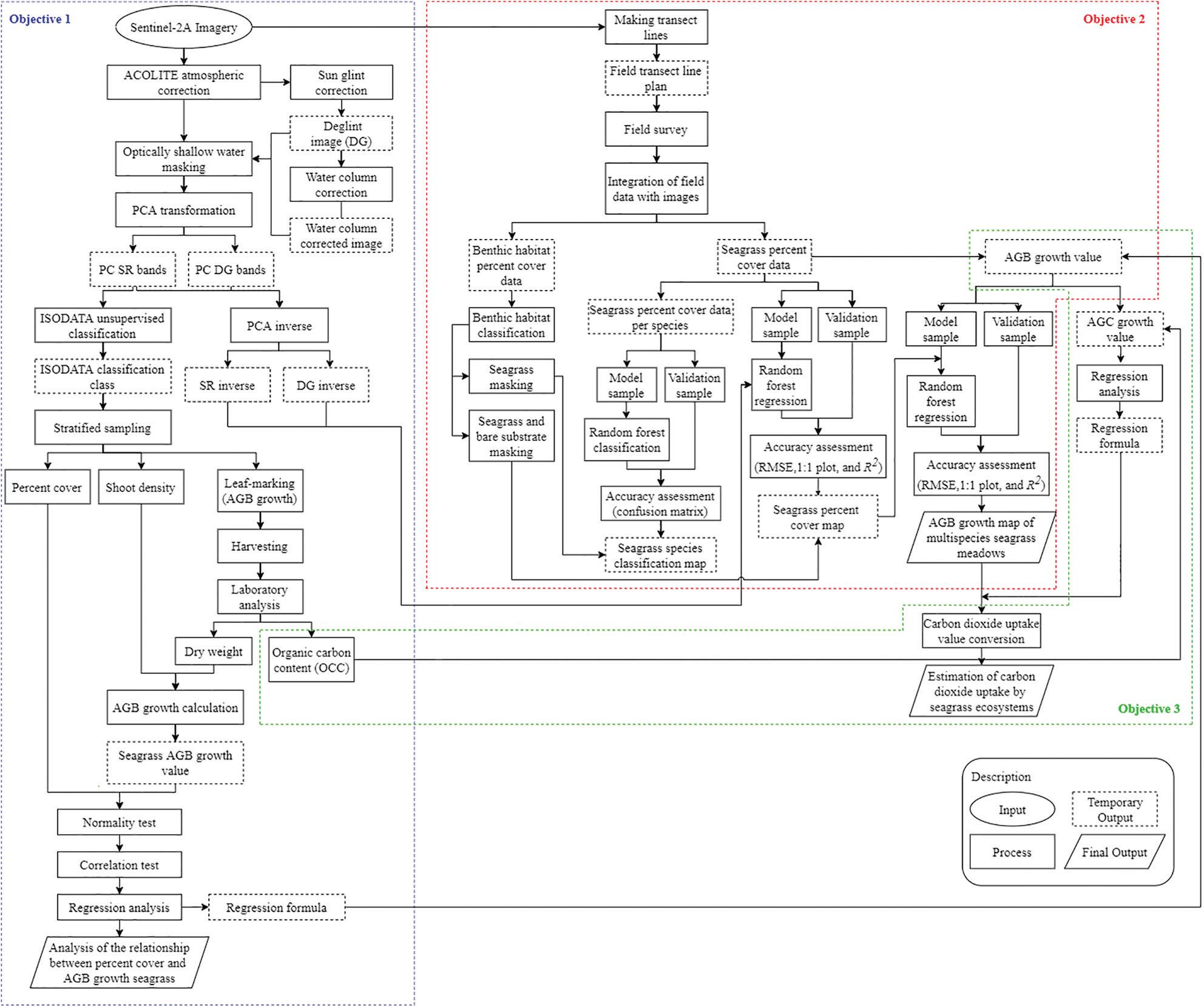 Remote sensing provides a valuable tool for mapping seagrass meadows, as visible wavelengths can penetrate shallow waters and effectively capture object reflectance (Bukata et al., 1995). To accurately map carbon dioxide uptake, data with sufficient scale, detail, and resolution are essential to minimise generalisation errors (Bell et al., 2006; Kenworthy et al., 2006). Remote sensing imagery enables the extraction of key seagrass parameters, such as distribution, coverage, and biomass, which are critical for understanding biomass growth (Hossain et al., 2015). However, remote sensing-based assessments of carbon dioxide uptake by seagrass remain rare in Indonesia. This approach holds significant potential, as it allows for more efficient annual estimates of carbon dioxide uptake (Wicaksono, 2017).