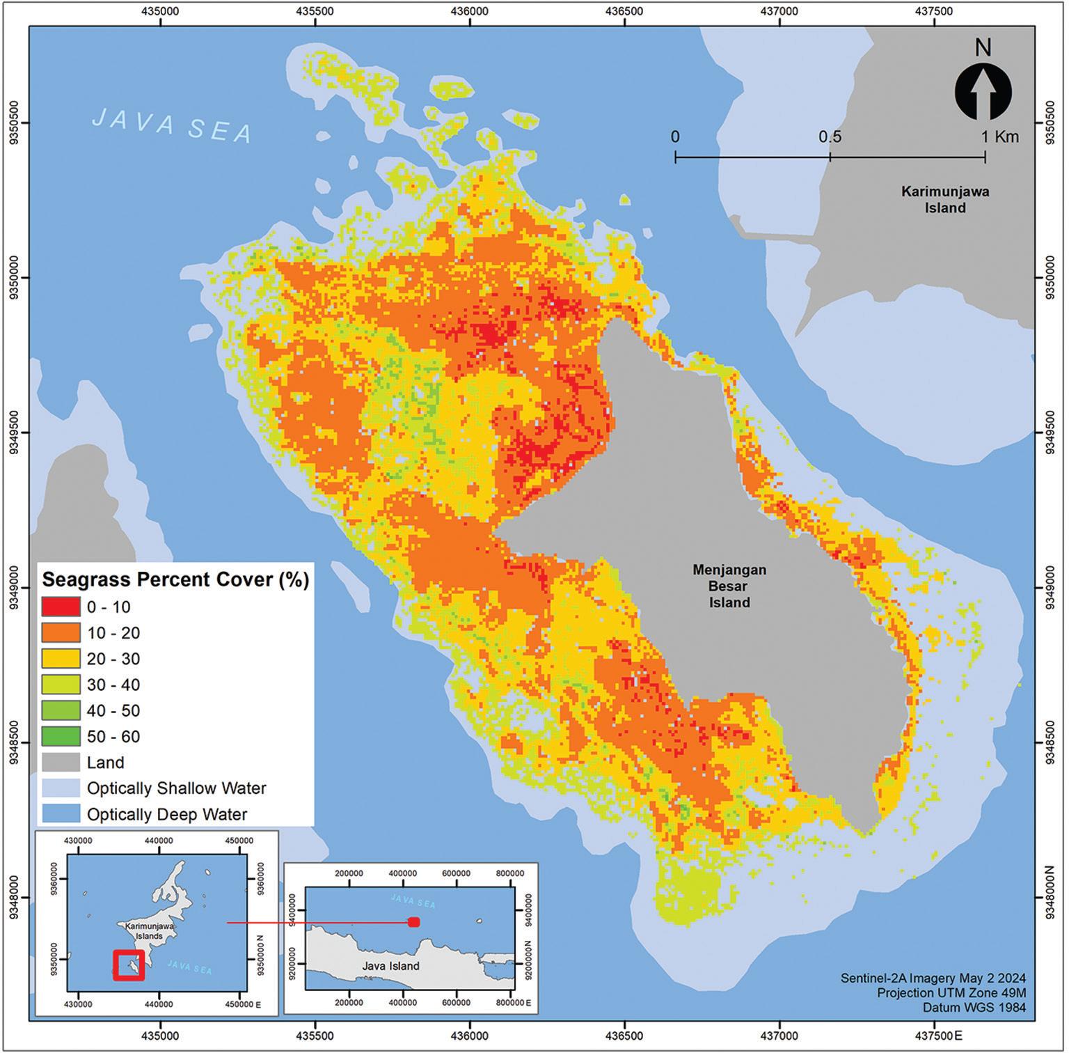 Seagrass is a marine angiosperm that forms an integral part of coastal ecosystems, thriving in shallow marine environments (Fauzan & Wicaksono, 2021; Wicaksono et al., 2019). Globally, 58 seagrass species have been identified, 13 of which are found in Indonesia (Kuo, 2007). Among the regions in Indonesia with extensive seagrass meadows is the Karimunjawa Islands, designated as part of the national forest. In this area, seagrass meadows are widely distributed along the coastline, with percent cover ranging from 9% to 83.33% (Nababan et al., 2010). Seagrass ecosystems provide numerous critical ecological, social and economic benefits. Ecologically, they function as primary producers and serve as habitats and nursery grounds for various marine species, including fish, shellfish and turtles (Guinotte & Fabry, 2008). Socially, seagrass meadows support local fisheries, acting as vital fishing grounds for coastal communities and contributing to food security (Arkham et al., 2015). Economically, seagrass and macroalgae ecosystems have an estimated annual value of up to US$19000 per hectare, which is 23–33 times higher than the average economic value of marine and terrestrial ecosystems, three times higher than coral reefs and 10 times higher than tropical forests (Björk et al., 2008; Costanza et al., 1997).