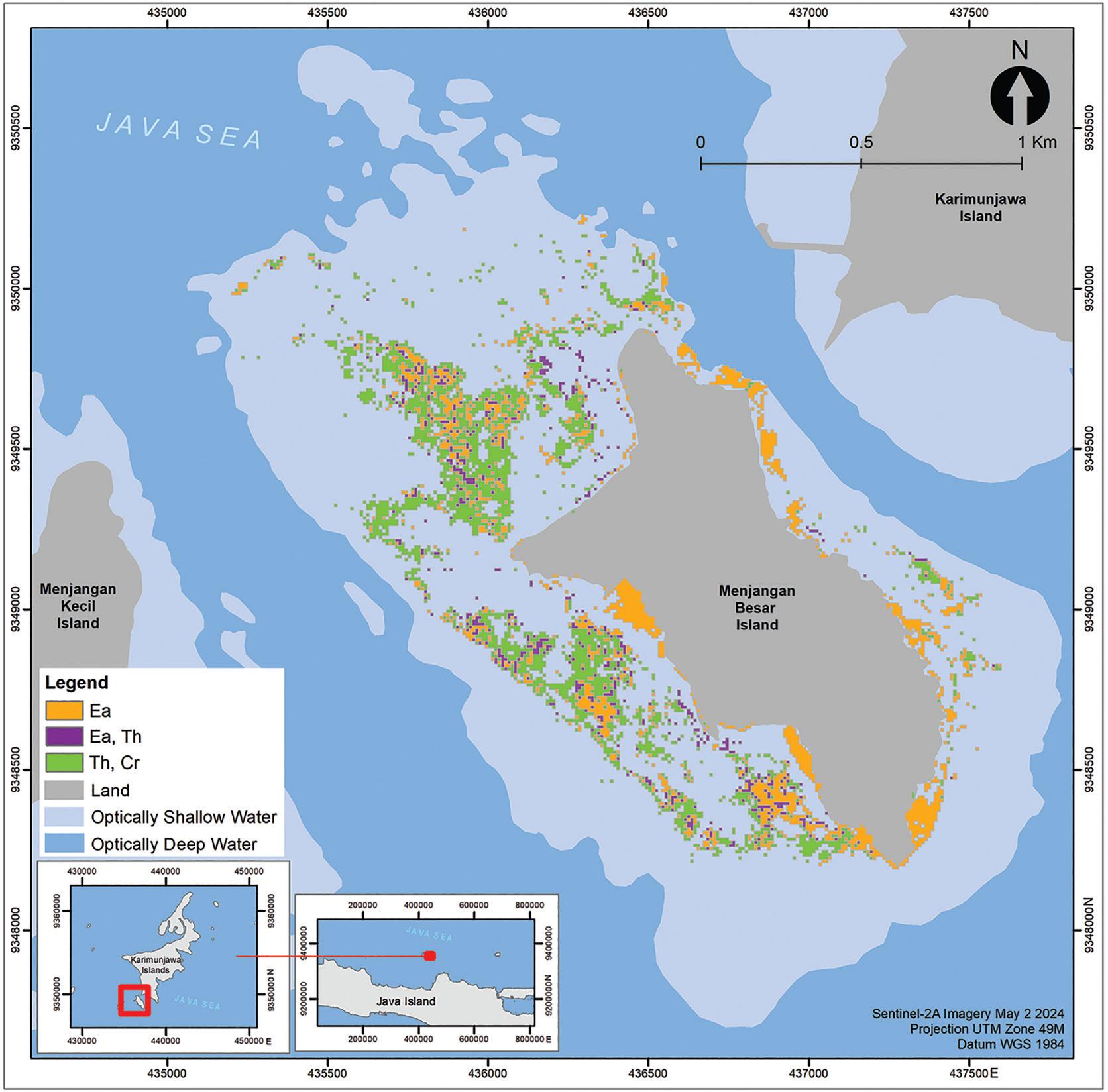 The results of the species composition classification are presented in Figure 5. The classified area covers 0.518 km2, comprising class Ea with an area of 0.195 km2 (37.6%), class Th-Cr with 0.268 km2 (51.7%), and class Ea-Th with 0.060 km2 (11.7%). Based on these classifications, it can be concluded that Th-Cr species predominantly grow in the shallow waters surrounding Menjangan Besar Island. This class is primarily distributed in clusters along the western and southwestern parts of the island. Additionally, Th-Cr species are found in the northwest, often in association with other species classes.