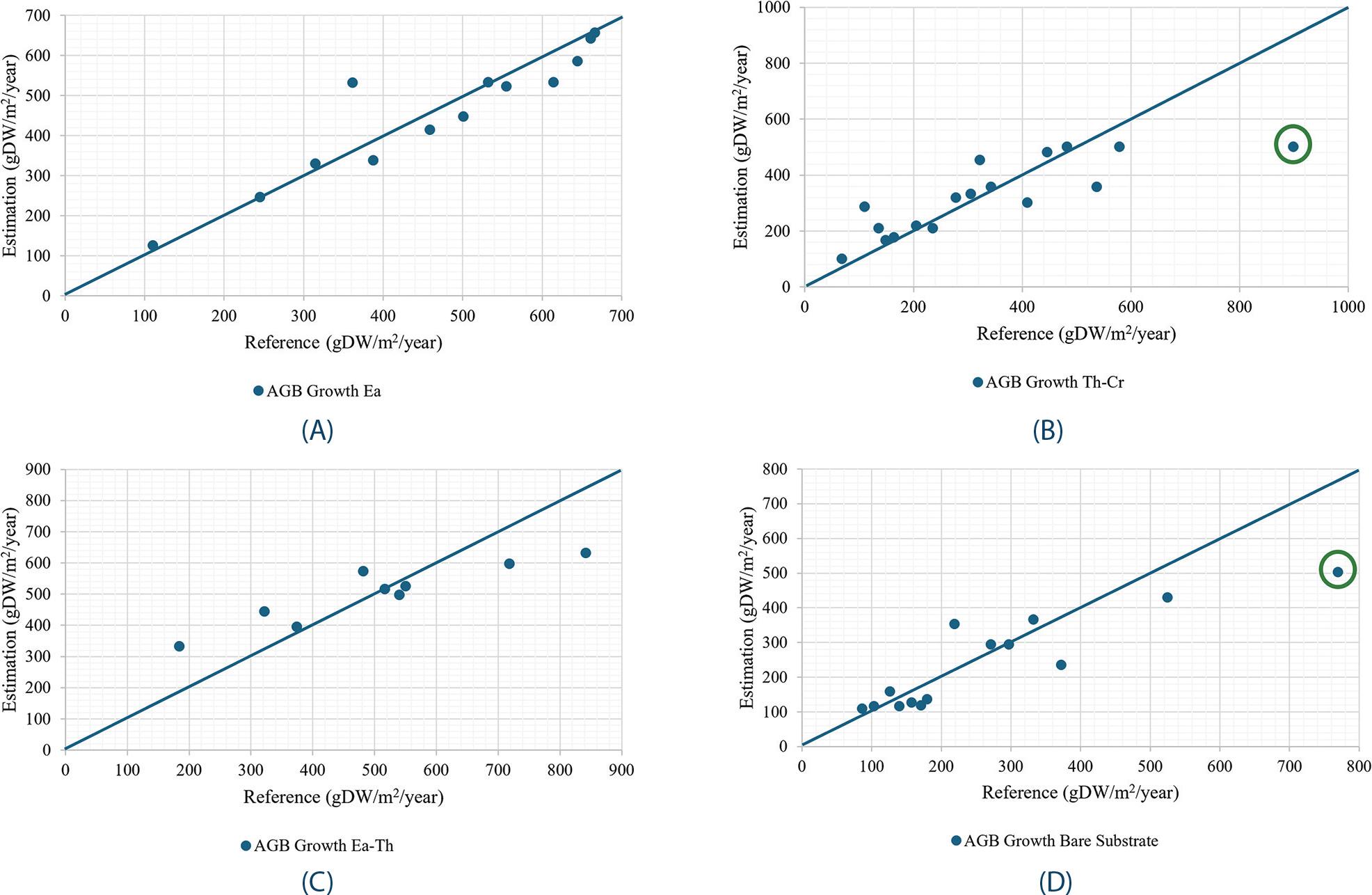 The 1:1 plot between reference and estimated AGB growth values for classes: (A) Ea, (B) Th-Cr, (C) Ea-Th, (D) BS. AGB, aboveground biomass; BS, bare substrate.