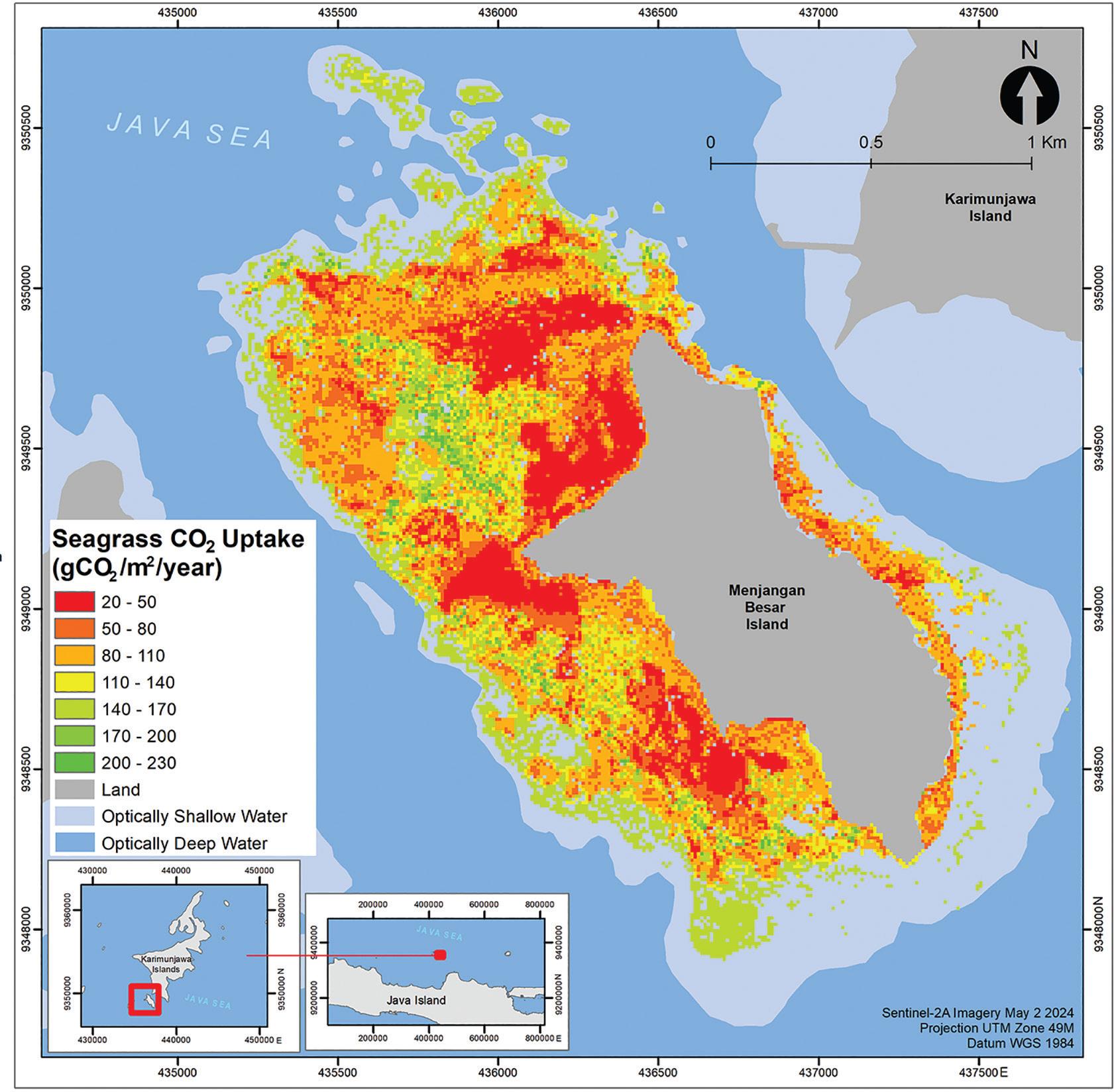 The CO2 uptake estimation map of the multispecies seagrass meadow of Menjangan Besar Island.