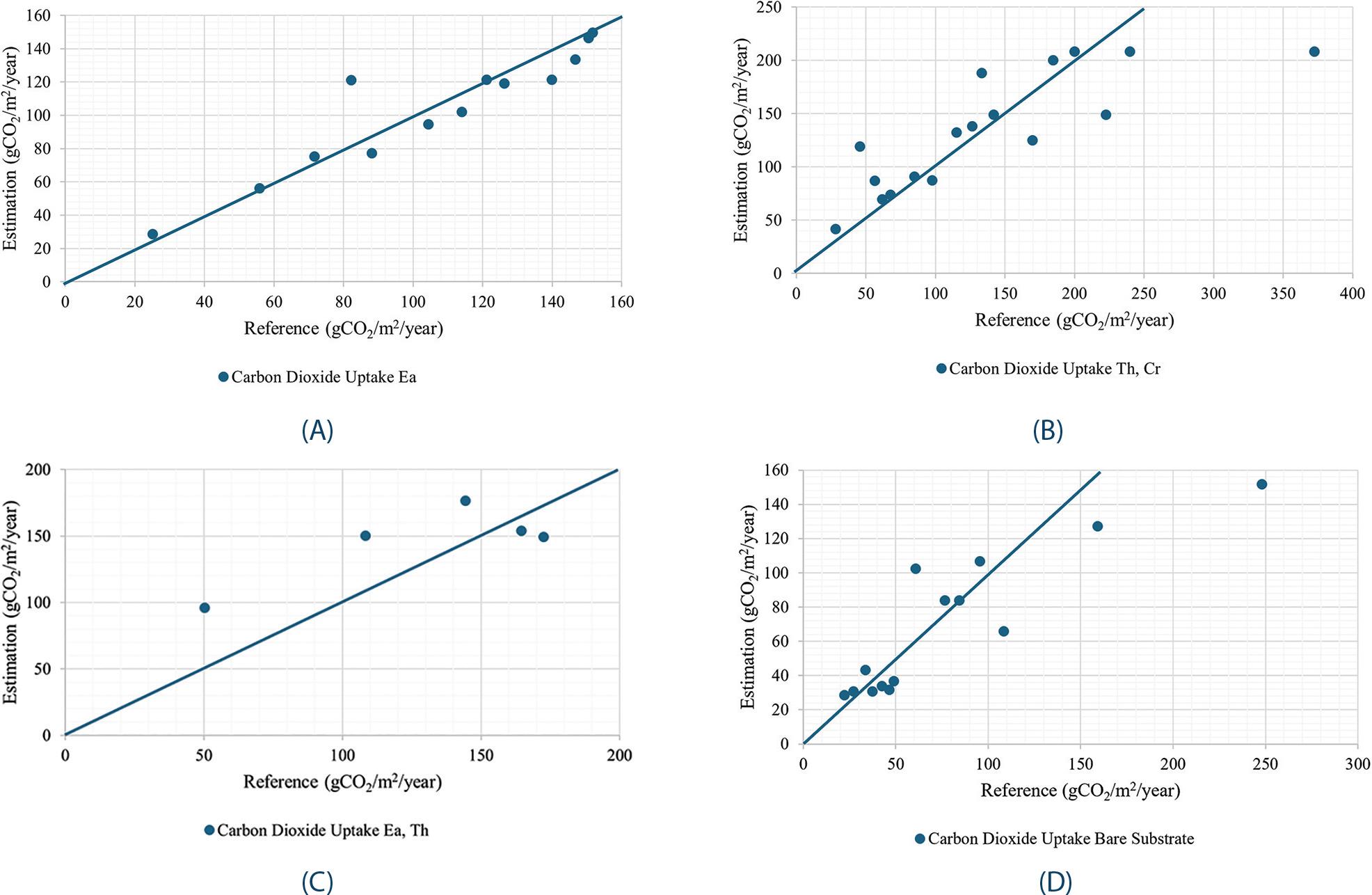 The 1:1 plot of field CO2 uptake reference and estimated values for: (A) Ea, (B) Th-Cr, (C) Ea-Th and (D) BS. BS, bare substrate.
