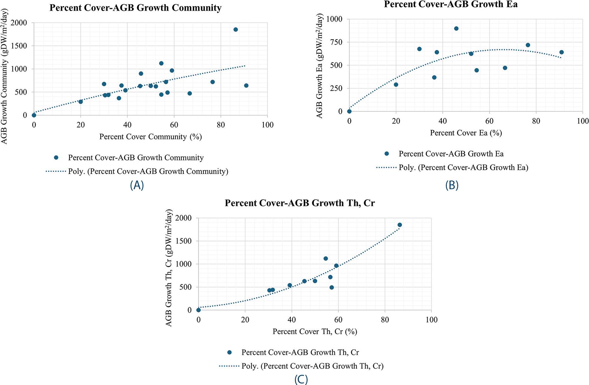 Relationship between seagrass percent cover and AGB growth at: (A) community, (B) species Ea, and (C) species Th-Cr. AGB, aboveground biomass.
