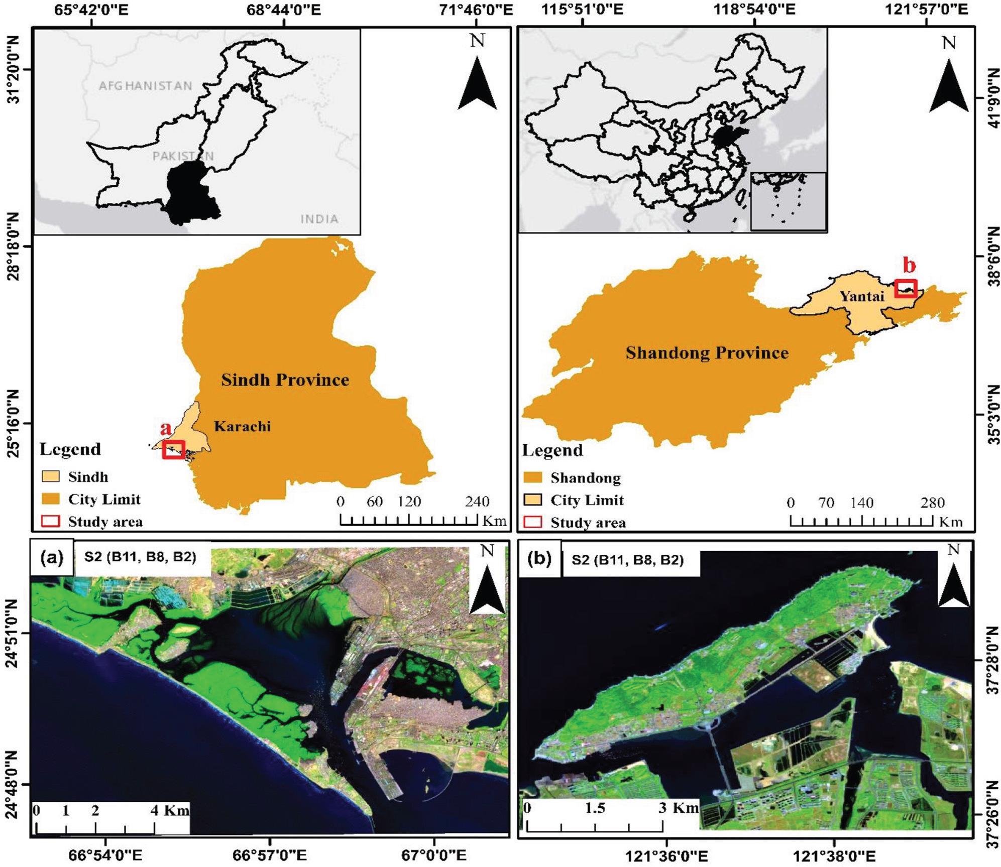 Sentinel-2 satellite imagery of the study areas. (A) TF for 2017 in KPT. (B) TF for 2017 in Yangma Island, Yantai. KPT, Karachi Port Trust; TF, tidal flat.