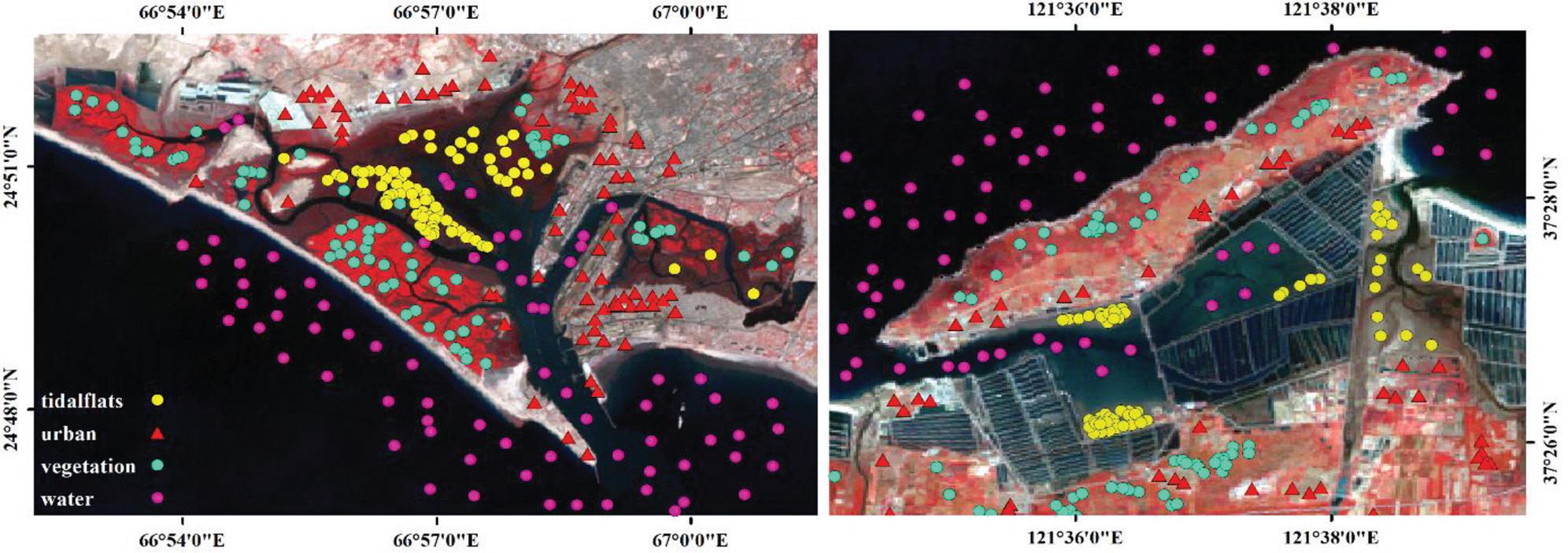 The sample points were manually gathered from Landsat and high-resolution Imagery from Google Earth, covering categories: TFs, water, vegetation, and urban (Fig. 2). To get training and validation data, random stratified sampling was used. A total of 2860 samples were utilized, comprising 65 samples for each feature from 11 different times of images.