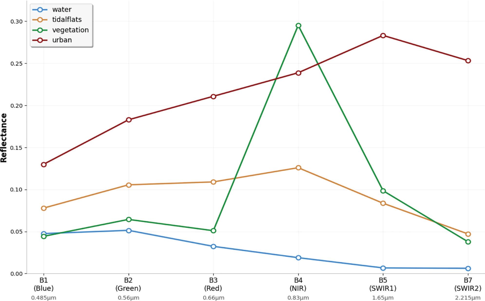 This study defines TFs as intertidal regions that consist of mudflats and sandflats situated between the highest and lowest recorded tidal extents, including areas that are consistently inundated during high tide and revealed during low tide. These regions may encompass sandy, muddy, and rocky substrates, as observed along the beaches of Karachi and Yangma Island (Murray et al., 2019c; Wang et al., 2020). After getting the high tide and low tide images of Landsat series, we did the spectral analysis of different land covers for quantifying the characteristics of TFs. The average spectral reflectance curves for water, TF, vegetation, and urban classes were derived using eleven high-resolution satellite images acquired at different time periods. The number of samples for each class is 715, 710, 628, and 807 respectively (Fig. 3).