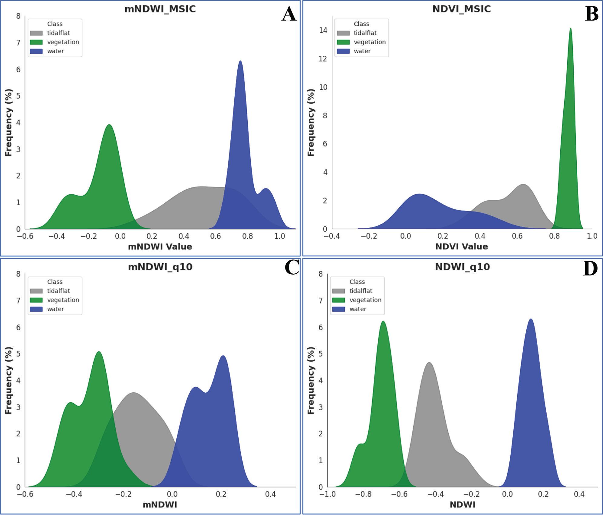 NDWI was chosen over NDVI and mNDWI for this phase because of its superior sensitivity to sediment-rich, shallow waters commonly observed during low tide. NDVI was utilized only for comparative analysis and excluded from the final composite generation because of its restricted discrimination ability under low-tide conditions. Figs 4B–4D illustrate that NDVI and mNDWI quantile composites demonstrated considerable overlap between vegetation and TFs, but NDWI provided a clearer distinction. The ultimate minimum water composite (Fig. S2B in the Supplementary Materials) illustrates the least water coverage, omitting vegetated areas and permanent water bodies.