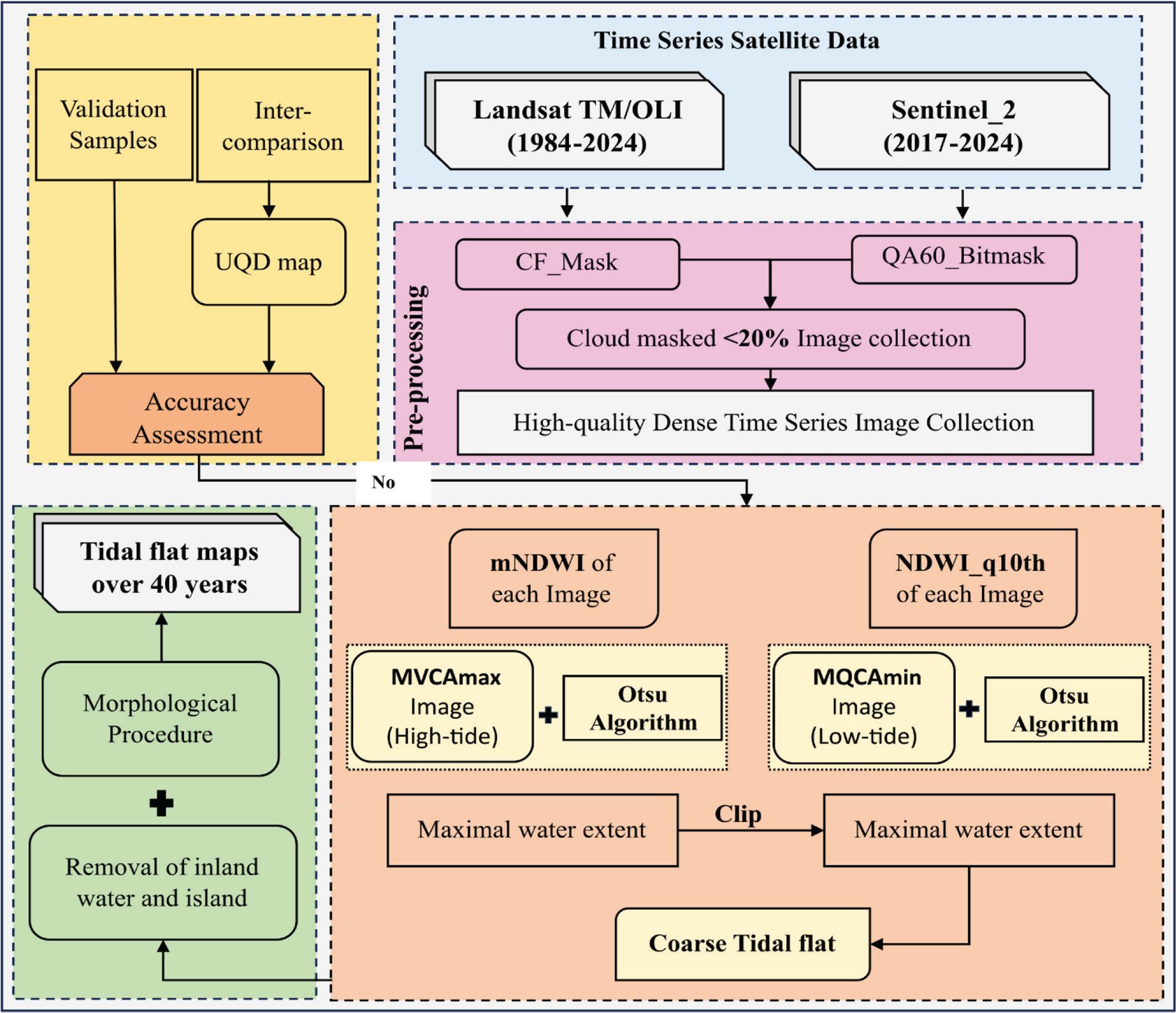 This study presents a hybrid framework for TF mapping that integrates the advantages of MSIC, Quantile Composite (10th percentile), and Otsu-based land-water segmentation. In contrast to other methodologies that utilize a singular tidal condition or a single index (e.g., Jia et al., 2021; Zhao et al., 2020), our methodology encompasses both extremes of tidal inundation by employing long-term satellite imagery, independent of tidal elevation models. This composite method is scalable and suitable for diverse tidal regimes, consisting of three key steps: (1) Landsat and Sentinel long-term imagery were obtained and processed using the GEE cloud platform. This procedure comprised first screening for cloud cover, then using QA bands to remove clouds. (2) Then, the time-series change patterns of TFs were analyzed by computing optimal spectral indices (e.g., modified normalized difference water index [mNDWI], normalized difference water index [NDWI]) and applying the maximum value composite algorithm (MVCAmax) to identify maximum water extent and the minimum quantile composite algorithm (MQCAmin) to detect minimum water levels. (3) Subsequently, the Otsu automated thresholding algorithm was employed for precise land-water segmentation, followed by a clipping operation to isolate TF areas by subtracting the minimum water extent from the maximum water extent. (4) We refined the TF maps by removing inland features, islands, and aquaculture ponds using a regional connectivity function and mathematical morphology. (5) For the extracted TFs, a qualitative and quantitative accuracy assessment was conducted.