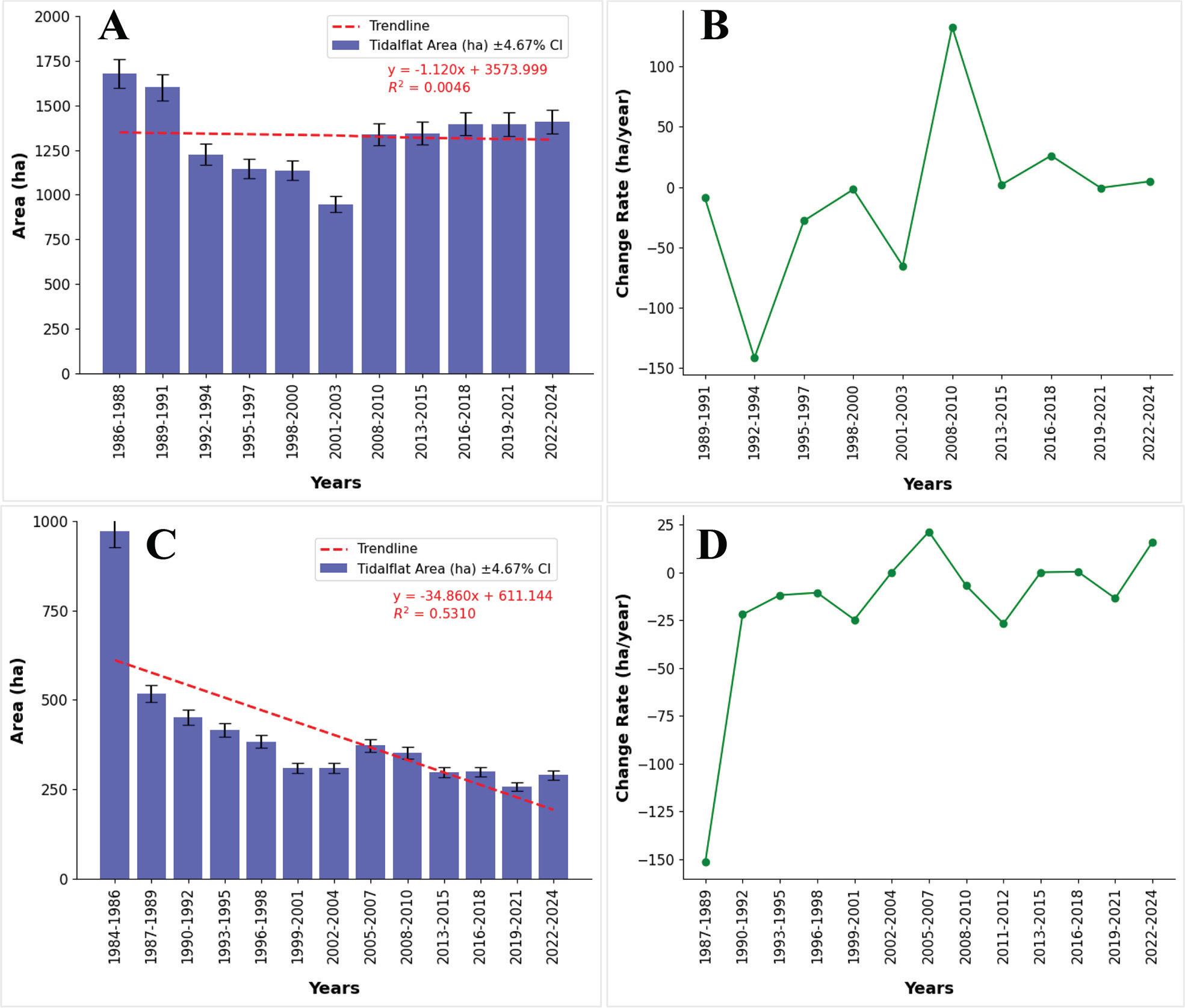 Furthermore, Fig. 6A demonstrates that in the last 40 years, the total area of TFs in KPT along the east coast has diminished by 270 ha, reflecting a total percentage loss over the entire period of 16.1%. The mean annual change during this timeframe was –7.12 ha, corresponding to an average annual reduction rate of 0.41%. The observed fluctuations, characterized by a weak trend (R2 = 0.0046), confirm that the changes are episodic and non-linear, dominated by specific periods of rapid loss and gain, rather than a steady, monotonic trend. The ±4.67% CIs (Table 3, Fig. 4) indicate classification uncertainty, thereby reinforcing the reliability of trend interpretation. The intertidal zone area is progressively increasing toward the southern side of the study region, with the expansion directed seaward.