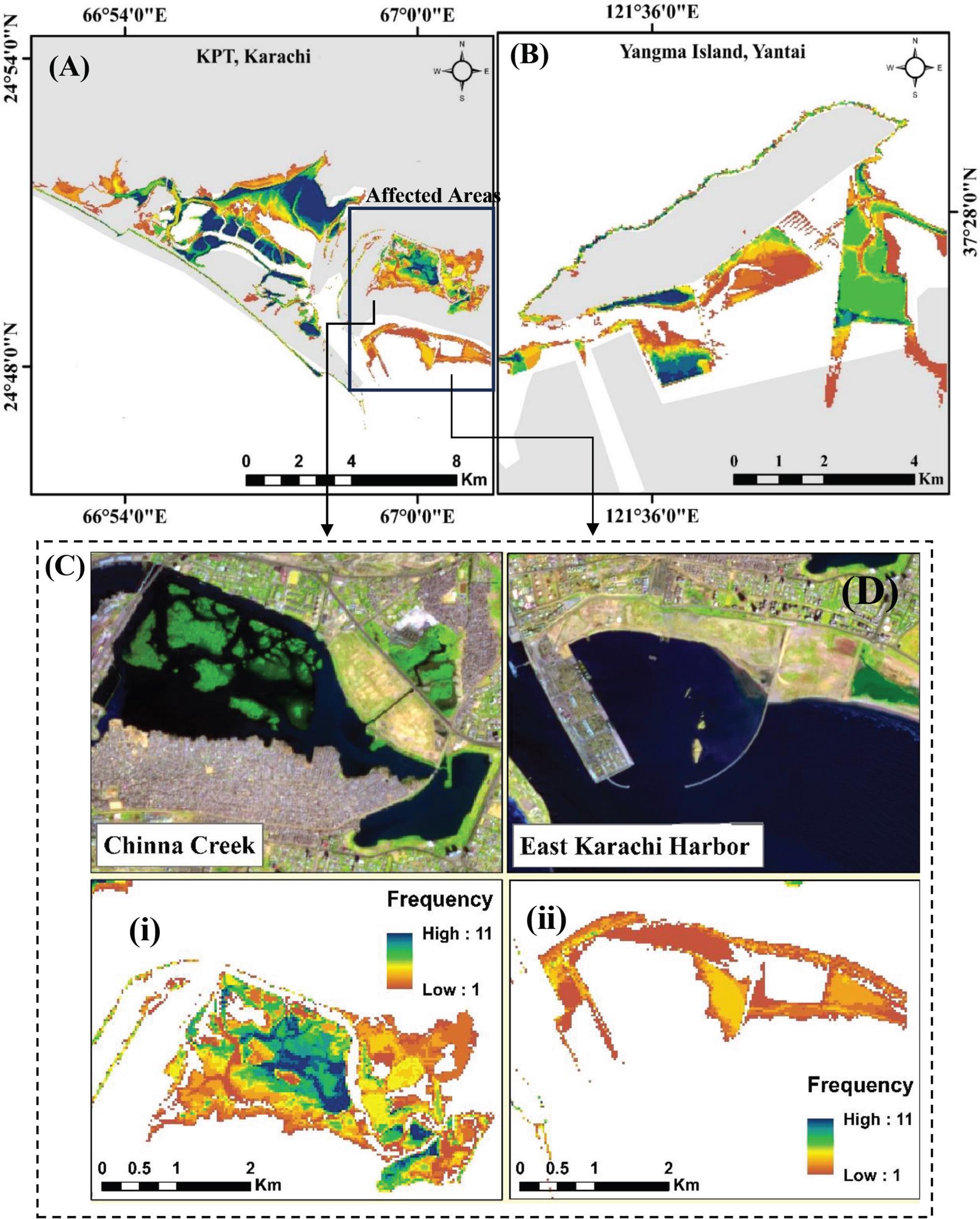 The frequency map delineates notable morphological changes at two key sites: the first is Chinna Creek, located near the coastline, while the second lies east of the Karachi Harbor Entrance (Fig. 9C). These changes are mainly due to human activities, such as port construction, land reclamation, and also natural forces, such as monsoon winds and tidal currents. The study (Fig. 7) illustrates that both areas have undergone processes of accretion and erosion over time. Chinna Creek expanded between 1986 and 2000, but after 2000, it began to shrink, primarily from the north to the south, due to land reclamation activities. The frequency distribution map (Fig. 9D) demonstrates reduced TF visibility, suggesting pronounced anthropogenic influence on the morphological dynamics of these intertidal zones.