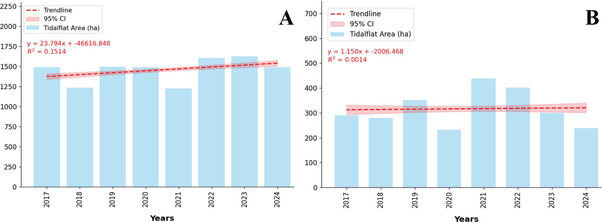 For a detailed analysis of TF dynamics in our study area, we utilized Sentinel-2 satellite imagery spanning the period from 2017 to 2024. Table 4 and Fig. 10 demonstrate that the TF area in the KPT region experienced a slight increase from 2017 to 2024. The low value of R2 suggests a small portion of variability impacted by both stochastic human factors and interannual tidal oscillations, which inherently result in annual variations in TF extent. Conversely, the Yangma Island region in Yantai underwent a decline during the same timeframe.