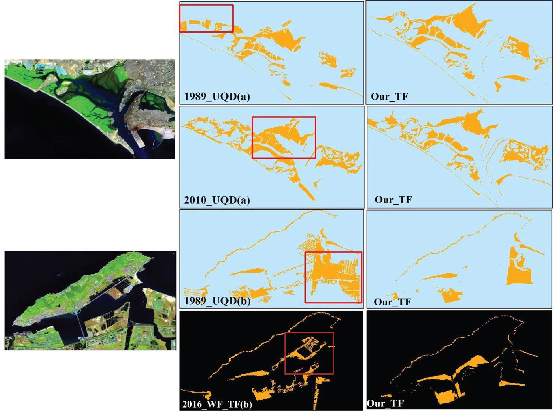 In contrast, the UQD reports 1661 ha and 808.2 ha using the Landsat imagery for the same regions and duration. The substantial differences in these area estimates can be largely attributed to the distinct methodologies used in determining tide-level information. The UQD dataset employs a random forest algorithm with a large number of training samples to generate 30-m resolution TF maps within a machine-learning framework. However, this approach frequently misclassifies aquaculture ponds, inland lakes, and salt marshes as TFs due to their overlapping spectral and temporal signatures, leading to overestimation in some areas.