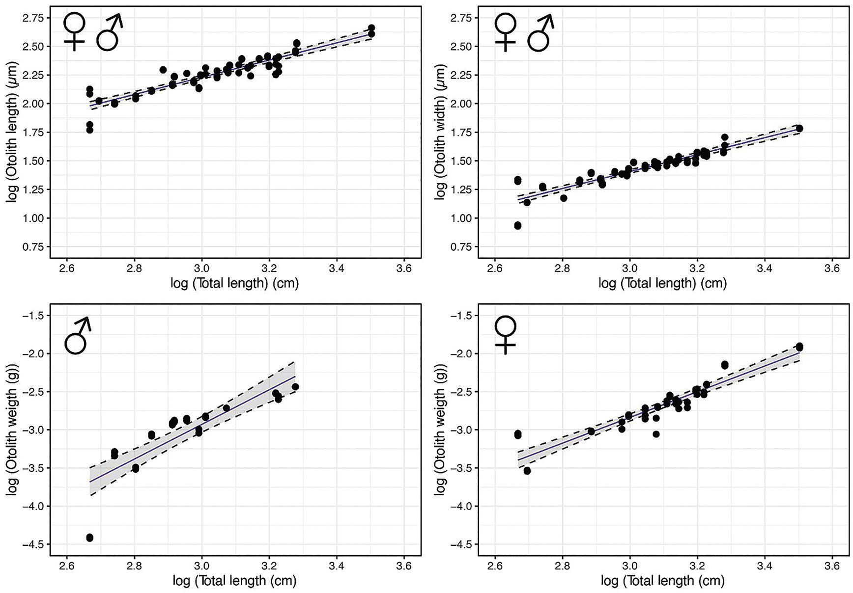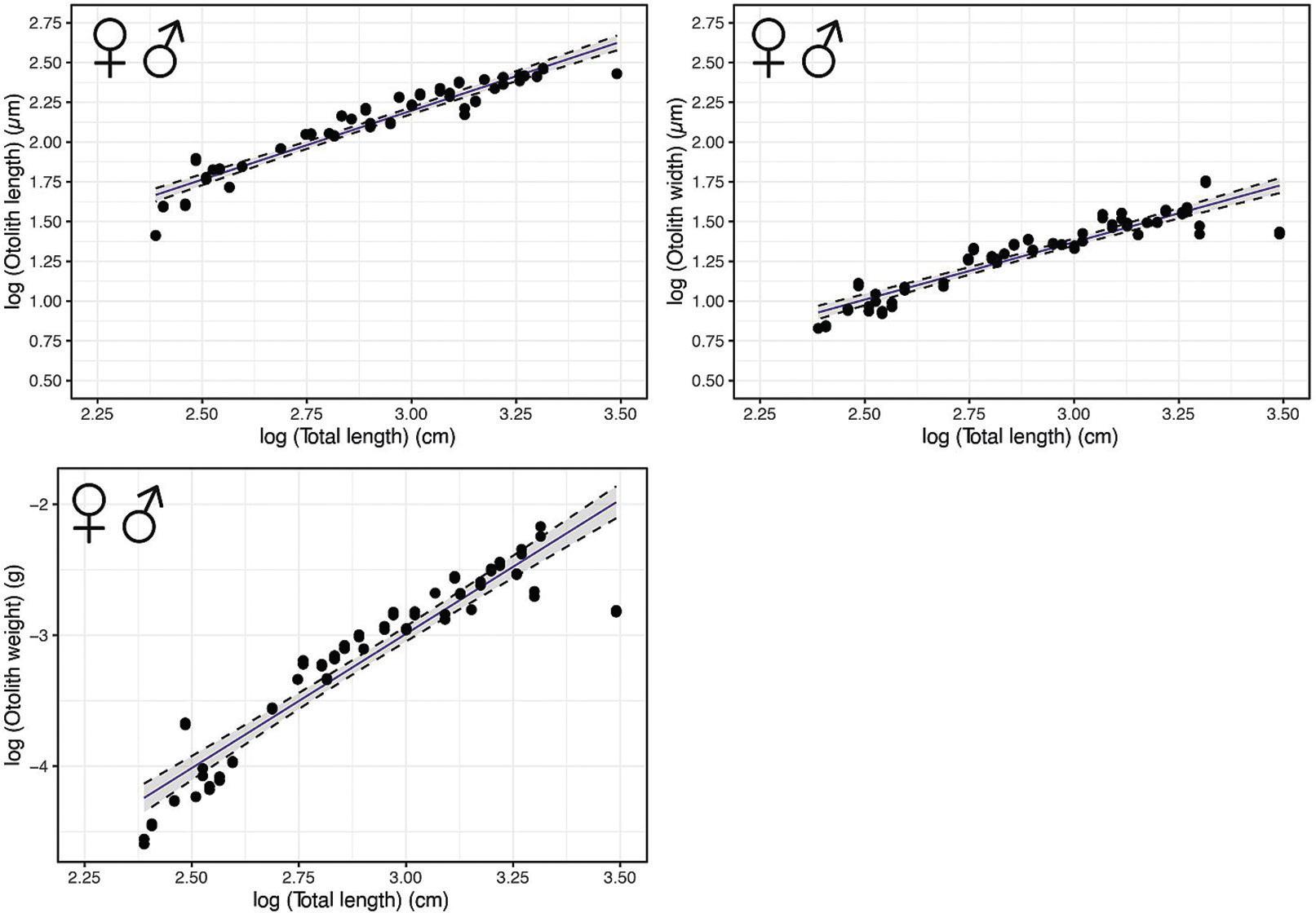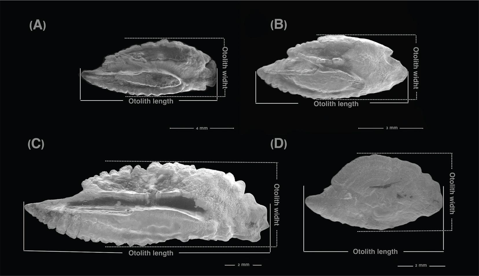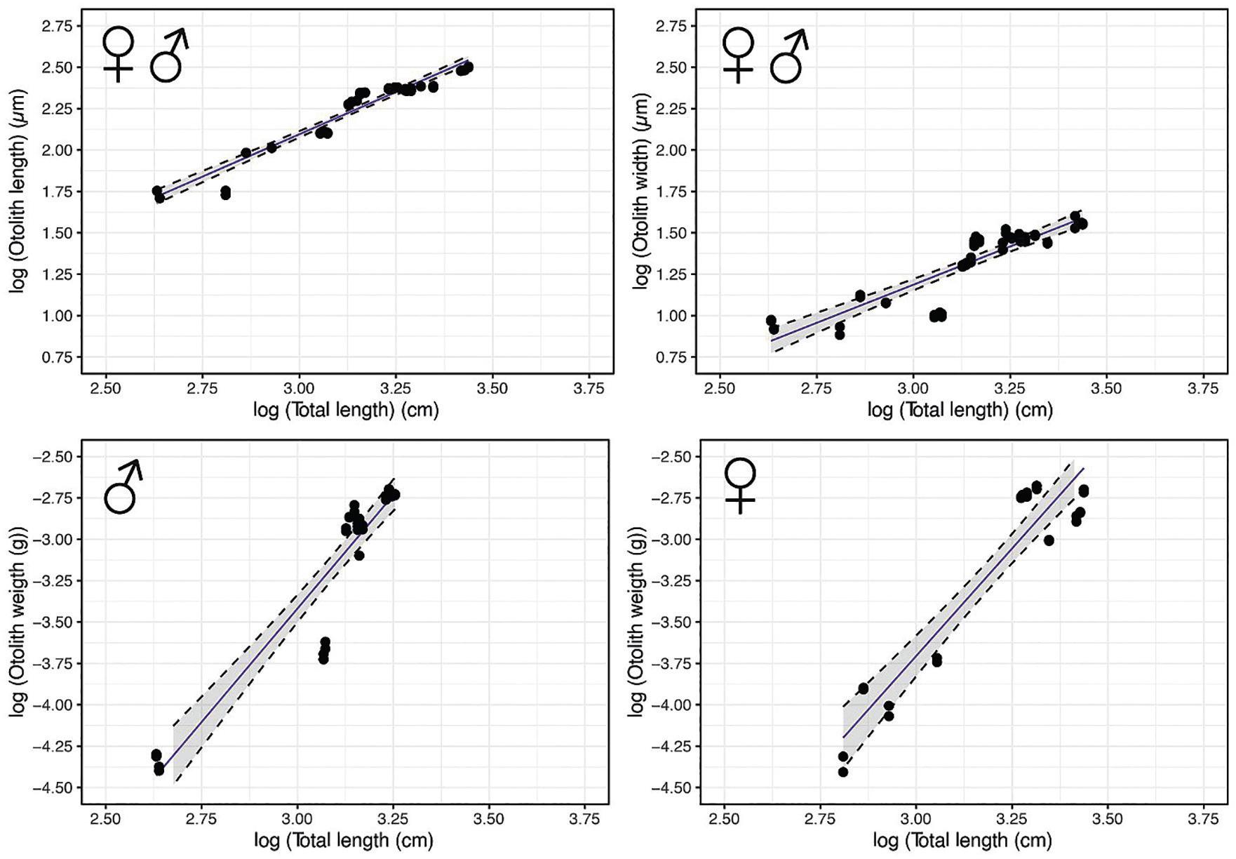 | H. dactylopterus | Combined | 54 | OL (μm) | log(TL) = 0.711 × log(OL)—0.001 | 0.77 | <0.001 |