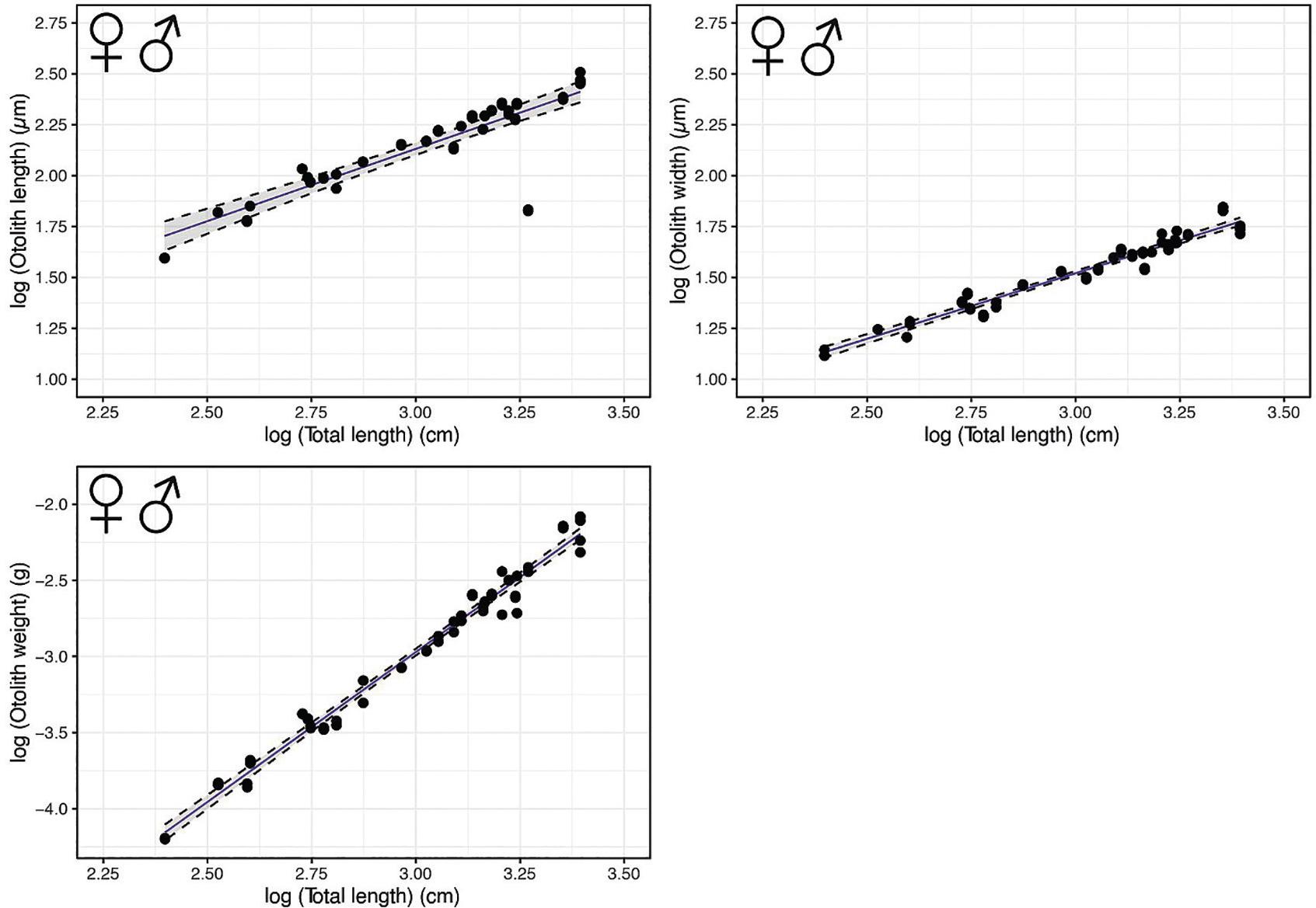 | Male | 28 | OWe (g) | log(TL) = 2.271 × log(OWe)—9.741 | 0.73 | <0.001 | |