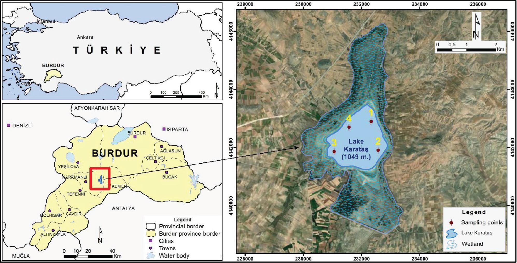 The Lakes Region is an area located in the southwest of Türkiye and contains 36 wetlands, which are very important in terms of economic, ecological and tourism (Oruçoğlu & Beyhan, 2019). Of all, 16 of these wetlands dried out in the last 30 years, and 20 of them are facing drought and water shortage (Işıldar & Ercoşkun, 2021). Karataş Lake is an important lake located in the lakes region. Unfortunately, it completely dried up in 2021. In the following years, it was able to hold water from time to time thanks to both the redirection of water resources in the basin and increased precipitation (Doğru Haber, 2022; Tekin-Özan et al., 2024). However, more recent reports indicate that the lake has largely dried again by late 2025 due to ongoing drought conditions (Çağdaş Burdur, 2025), highlighting the continued vulnerability of the system. Karataş Lake is 20 km away from Tefenni District and located between 37° 23′ 9″ E and 29° 58′ 18″ N (Seçmen & Leblebici, 2008). It was formed as a result of tectonic effects (Senkul & Kalıpcı, 2019). The lake is located at an altitude of 1050–1070 m above sea levels (Turkish State Meteorological Service, 2024). The main waters flowing into the lake are Akçay, Bozçay, and Bademli Stream (Karamanlı Kaymakamlığı, 2019). There are many reed and grain fields around the lake (Kazancı, 1999). There were 121 bird species in and around the lake, 61 of which were water birds, and it was an important nesting and sheltering area for these birds (Karamanlı Kaymakamlığı, 2019). In the past years, although Karataş Lake was used for fishing activities, tourism, agriculture, and irrigation and has great ornithological importance, unfortunately its water has decreased in recent years and has dried out from time to time (Kazancı, 1999; Kurt, 2006; Tekin-Özan et al., 2024; Turkish State Meteorological Service, 2024; Yarar & Magnin, 1997). Karataş Lake has been accepted as ‘Wildlife Protection Area’ in 2006 by council of ministers (Ministry of Forestry and Water Management, 2017).