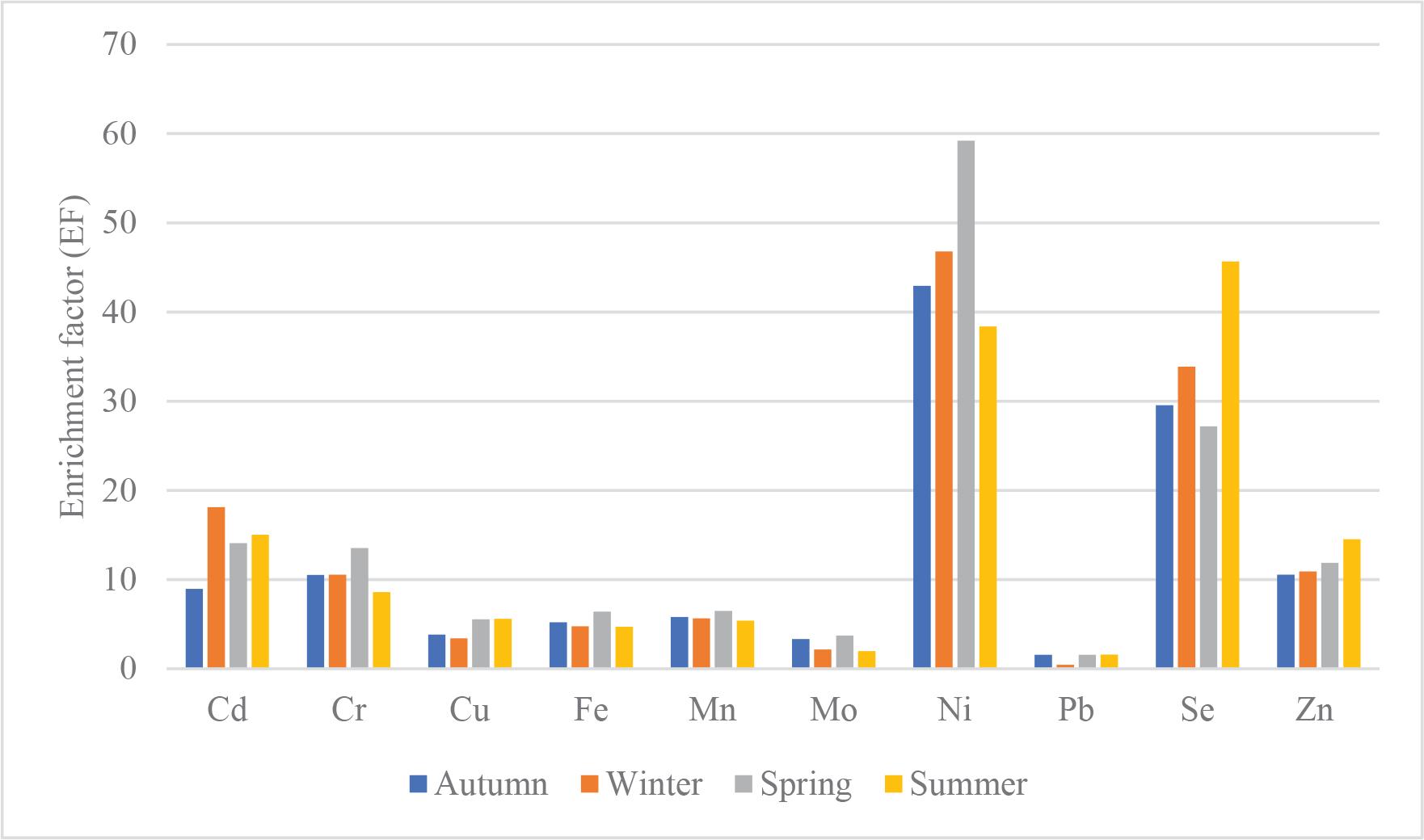 In Table 5 and Figure 2, the values of EF index were presented. Pb in all seasons and Mo in summer were at minimum enrichment level (EF < 2). Cu in autumn and winter, Mo in autumn, winter, and spring, Fe in winter and summer were at moderate enrichment level (EF = 2–5). Cd, Cr, Mn, and Zn in all seasons, Fe in autumn and spring, Cu in spring and summer were at significant enrichment level (EF = 5–20). Se in autumn, winter and spring, Ni in summer were at very high enrichment level (EF = 20–40). Ni in autumn, winter, and spring, Se in summer were at extremely high enrichment level (EF > 40). Özçelik and Tekin-Özan (2024) calculated EF values of Eğirdir Lake’s sediment and found that Pb was at an extremely high enrichment level (EF > 40) in autumn and winter, and at very high enrichment level (EF = 20–40) in summer and spring. Cr was at a significant enrichment level (EF = 5–20) in autumn and winter, and a minimum enrichment level (EF < 2) in summer and spring. Fe was at significant enrichment level (EF = 5–20) in autumn and winter, at moderate enrichment level (EF = 2–5) in summer and minimum enrichment level (EF < 2) in spring. Cu, Mn, and Ni were at a significant enrichment level (EF = 5–20) in autumn and winter, while at a moderate enrichment level (EF = 2–5) in summer and spring. In another study, it was determined that Cu and Zn were in moderate enrichment levels (EF = 2–5) and Cr was in the significant enrichment level (EF = 5–20) in Karataş Lake’s sediment (Kaya, 2021). If the EF value varies between 0.5 and 1.5, it is known that metals originate from Earth’s crust or natural weathering processes (Zhang & Liu, 2002). If EF value is greater than 1.5, it is thought that some of metals come from anthropogenic activities such as urbanization, agricultural activities, fossil fuels, industrialization, different living things, and different pollution sources (Islam et al., 2015; Klerks & Levinton, 1989; Zhang & Liu, 2002). It can be seen that all EF values are greater than 1.5, except for the value of Pb in winter. We can say that pollutants enter Karataş Lake from different sources.