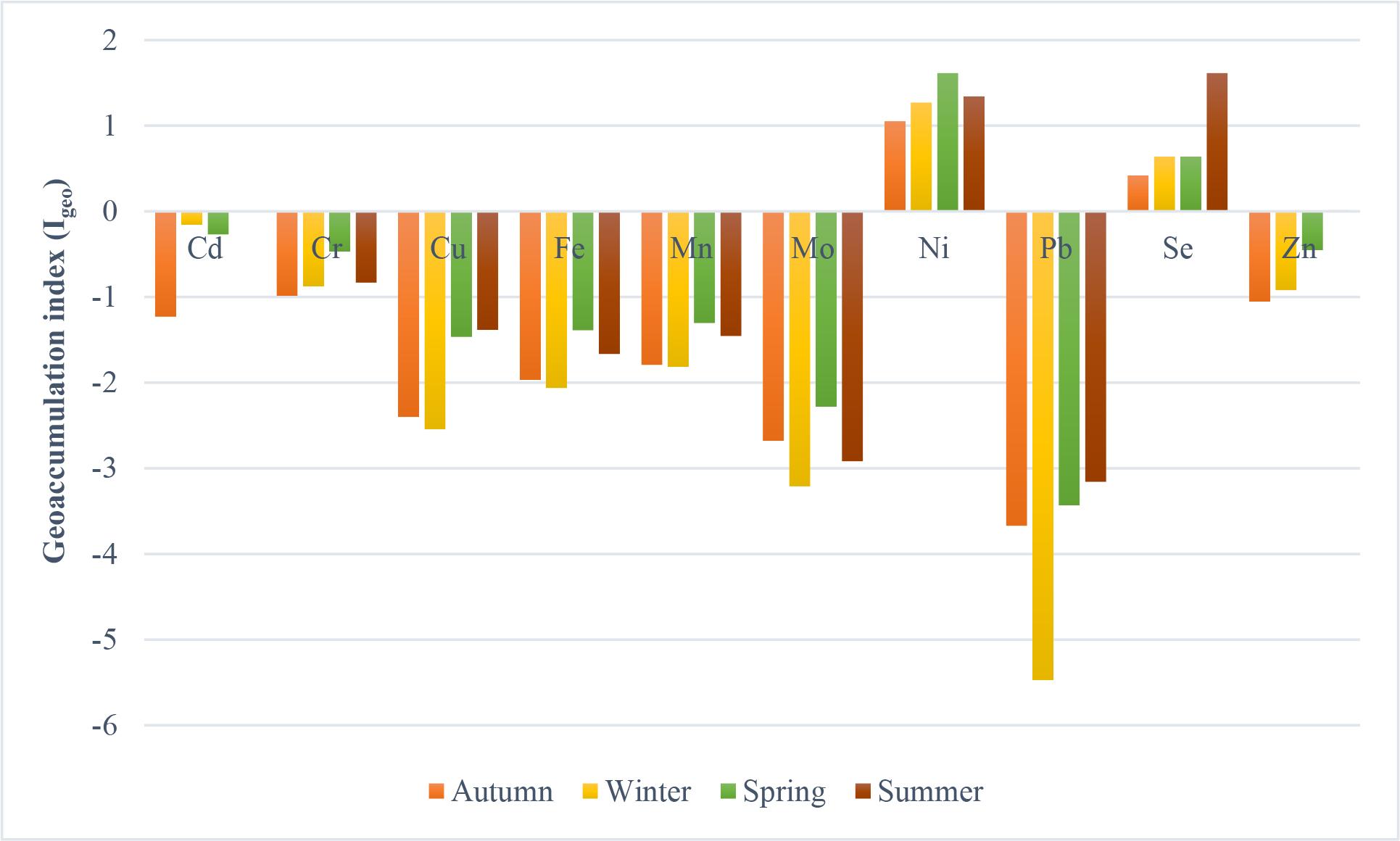 The CF values showed low pollution (CF < 1), moderate pollution (1 ≤ CF ≤ 3), and considerable pollution (3 ≤ CF ≤ 6) degrees in lake sediments (Table 5). Ni in all seasons and Se in summer were in the considerable pollution category (3 ≤ CF ≤ 6), Cd in winter, spring, and summer, Se in autumn, winter, and spring, Cr in spring, Zn in spring and summer were in moderate pollution category (1 ≤ CF ≤ 3). The other metals in all seasons were in low pollution category (CF < 1). The CF values of the heavy metals are sorted as follows Ni > Se > Cd > Zn > Cr > Mn > Fe > Cu > Mo > Pb. In the study carried out by Algül and Beyhan (2020) in Bafa Lake, heavy metals were ranked as Ni > Cd > Co > Cr > Pb > Fe > Mn > Cu > Zn according to the mean values of the CF. It was determined that Cu, Fe, Pb, and Zn were in moderate levels, Cr, As, Hg, Cd, and Al were in high levels, Mn and Ni were in very high levels according to CF values in the sediment of İkizcetepeler Dam Lake (Fural et al., 2020). According to the CF results in the Gala Lake sediment, Pb, As, Cd, Cr, Ni, Zn, and Cu were in low contamination class in winter and summer (Öztura, 2023).