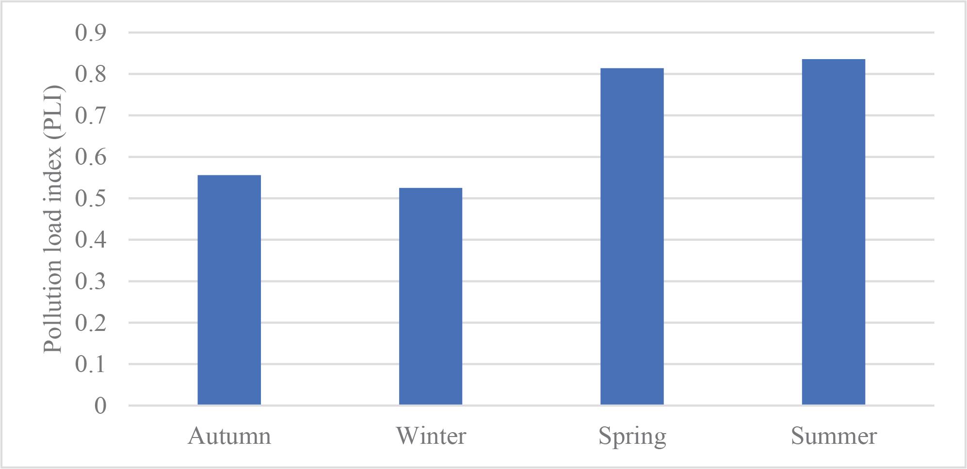 As seen Figure 4, PLI values varied between 0.525 and 0.836. If the PLI value is >1, it indicates that there is heavy metal pollution in the environment; if it is <1, it indicates that there is no heavy metal pollution (Tomlinson et al., 1980). Karataş Lake sediments showed no pollution (PLI < 1) for all metals in all seasons.