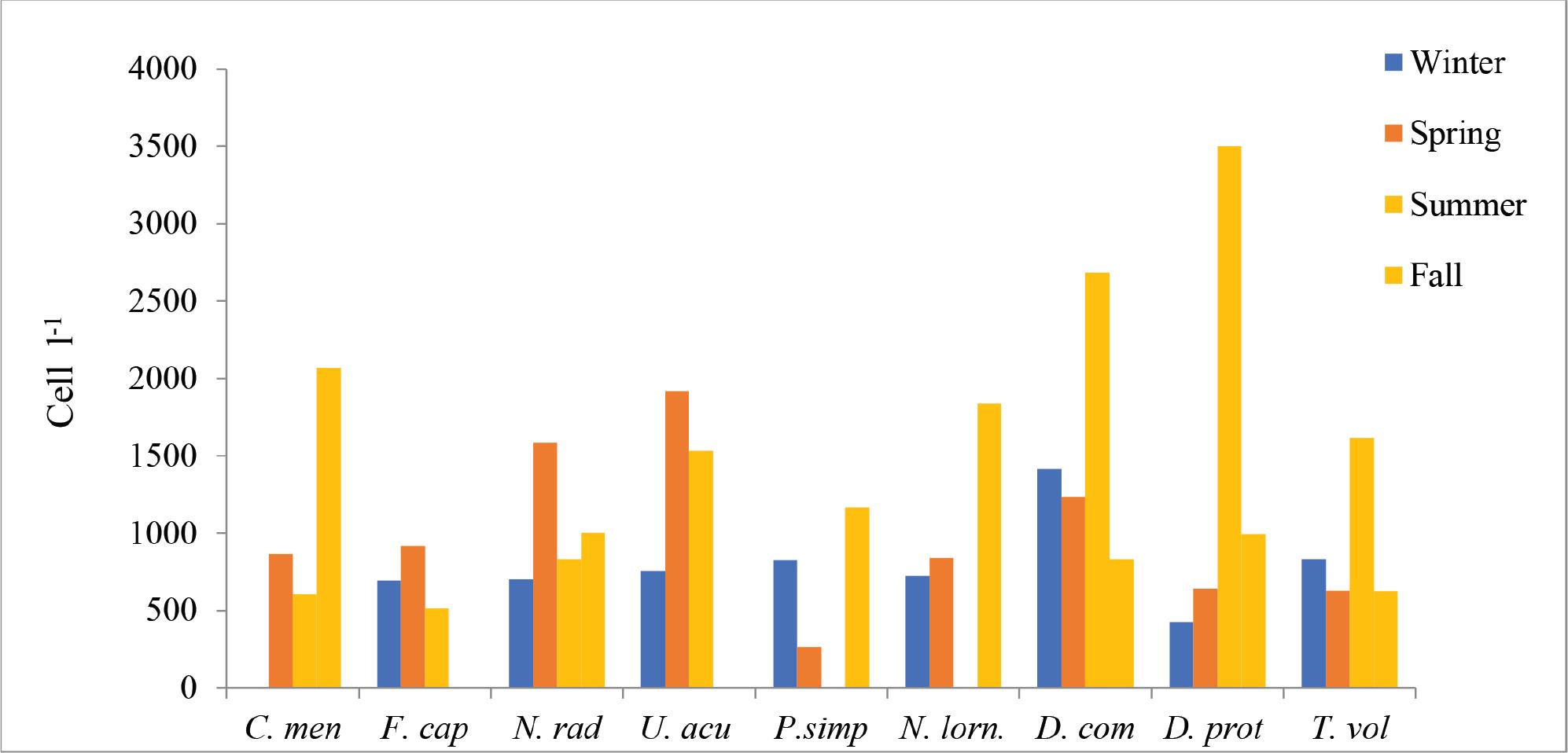 In winter 2015, seventeen phytoplankton species were identified; Desmodesmus communis (E. Hegewald) E. Hegewald from Chlorophyta was the dominant species. In spring 2016, twenty-three species were identified; Fragilaria capucina Desmazières, Navicula radiosa Kützing and Ulnaria acus Kützing from Heterokontophyta were dominant species. In summer 2016, forty-six phytoplankton species were identified; D. communis, Desmodesmus protuberans (F. E. Fritsch & M. F. Rich) E. Hegewald from Chlorophyta; Cyclotella meneghiniana Kützing, U. acus from Heterokontophyta and Trachelomonas volvocina (Ehrenberg) Ehrenberg from Euglenozoa were dominant species. In fall 2016, thirty-one species were identified; C. meneghiniana and Nitzschia lorenziana Grunow from Heterokontophyta and Pediastrum simplex Meyen from Chlorophyta were dominant species (Fig. 2).