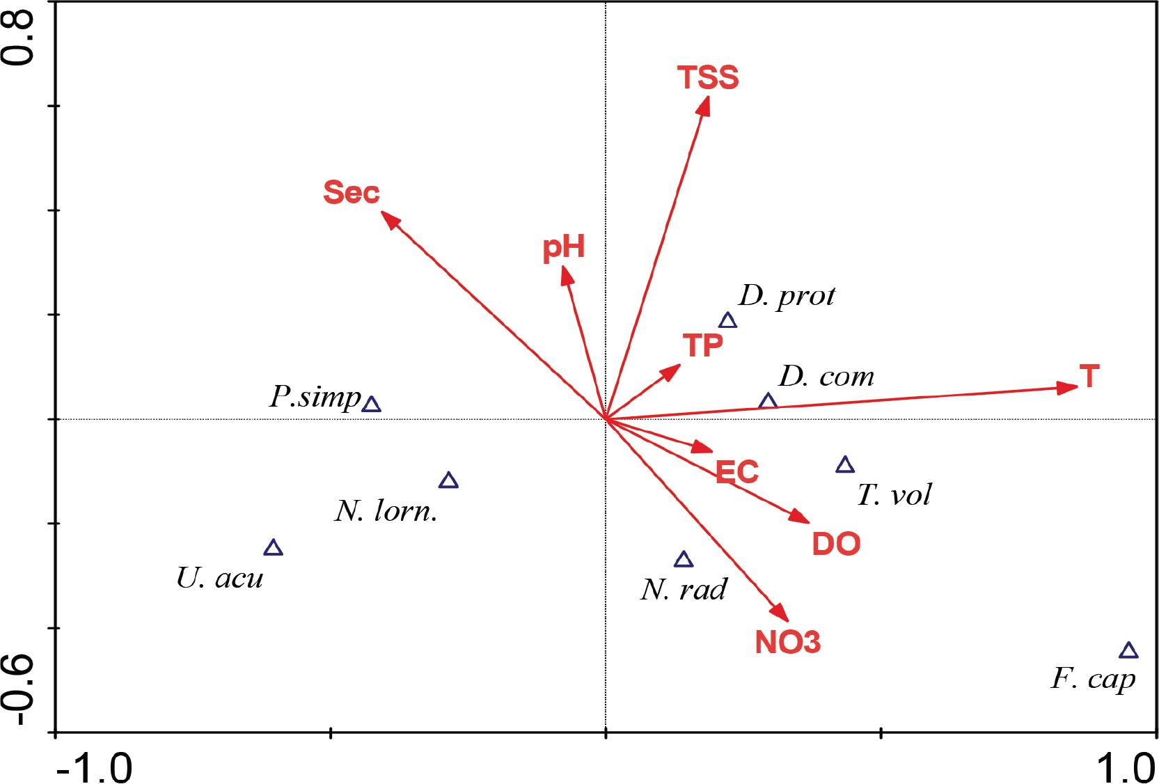The first two axes of CCA explained 84.1% of the cumulative variance in environmental factors and dominant species relationships (Table 4). CCA results confirm significant correlations between TN, NO3-N, EC, DO and dominant taxa. In CCA diagram, N. radiosa was closely related to NO3-N, D. communis to T, T. volvocina to DO and D. protuberans to TP. The rest of the dominant species (F. capucina, N. lorenziana, U. acus and P. simplex) were not associated with any measured physical or chemical variables (Fig. 3).