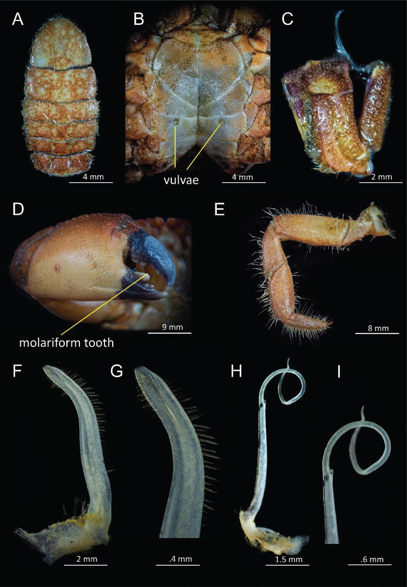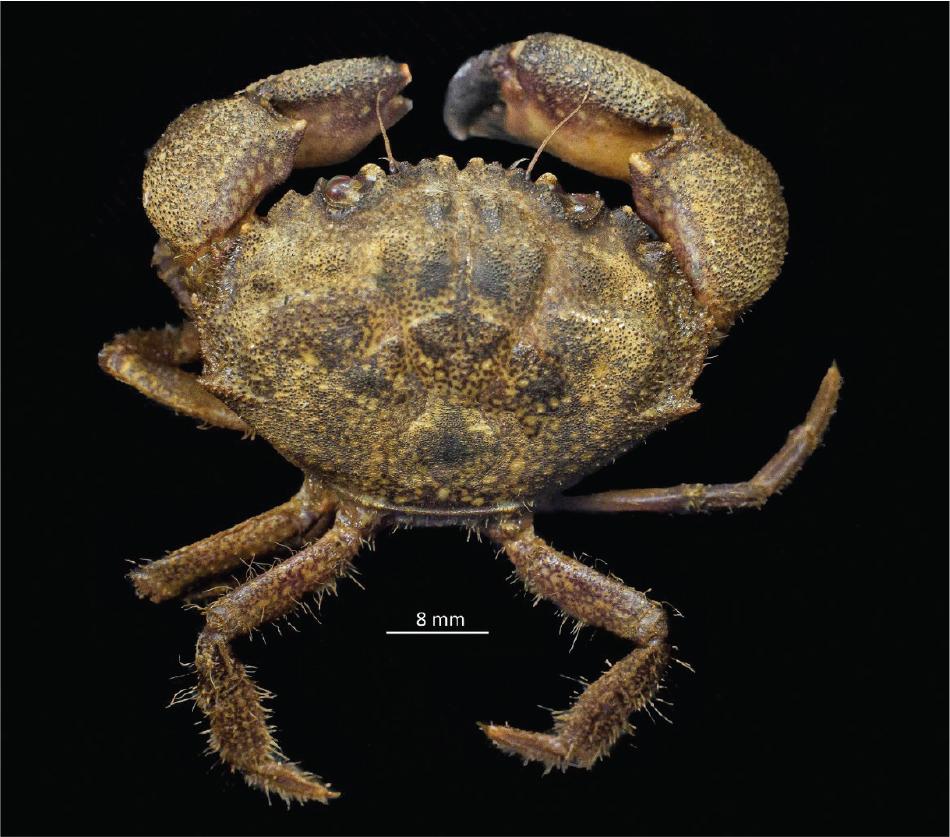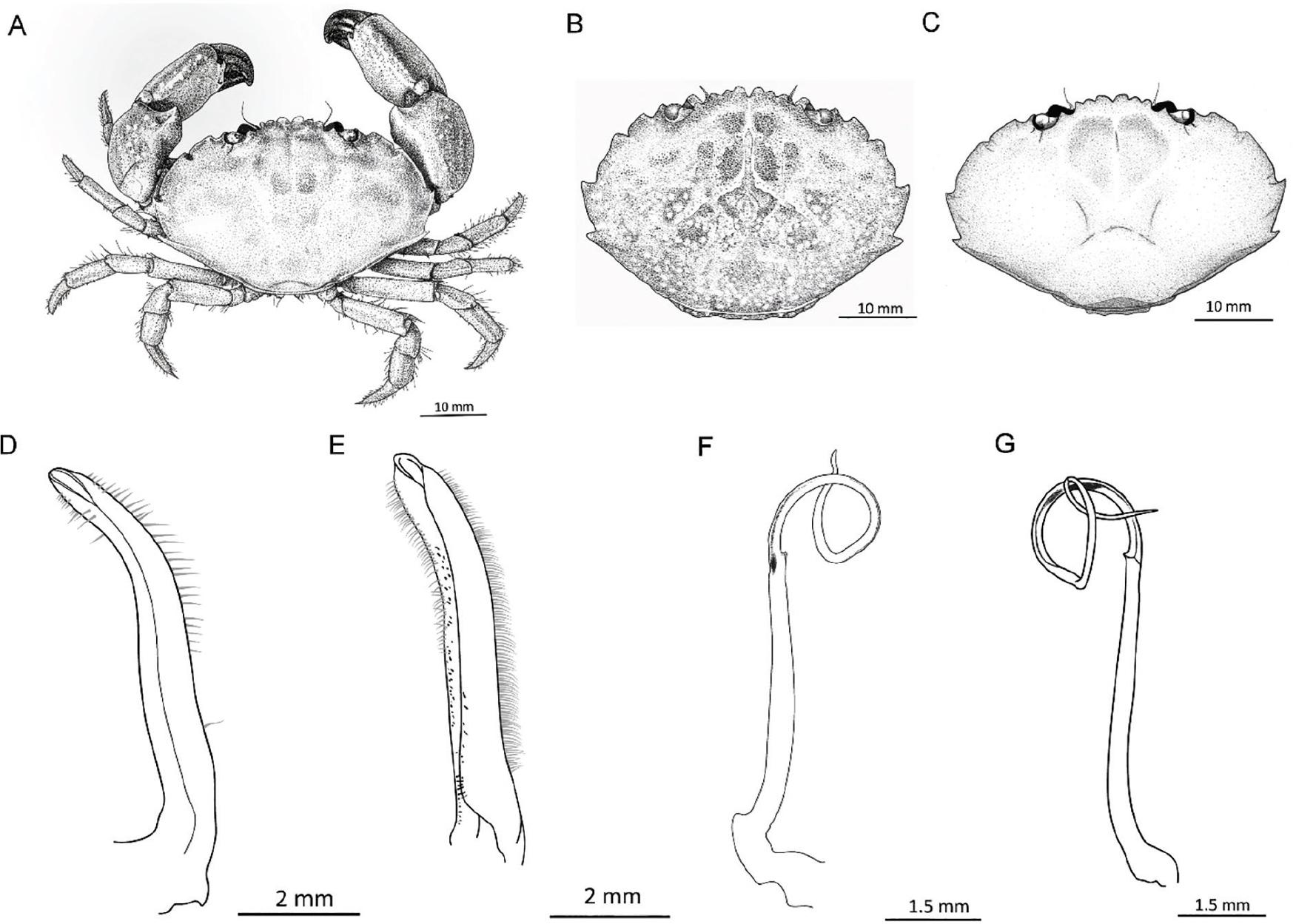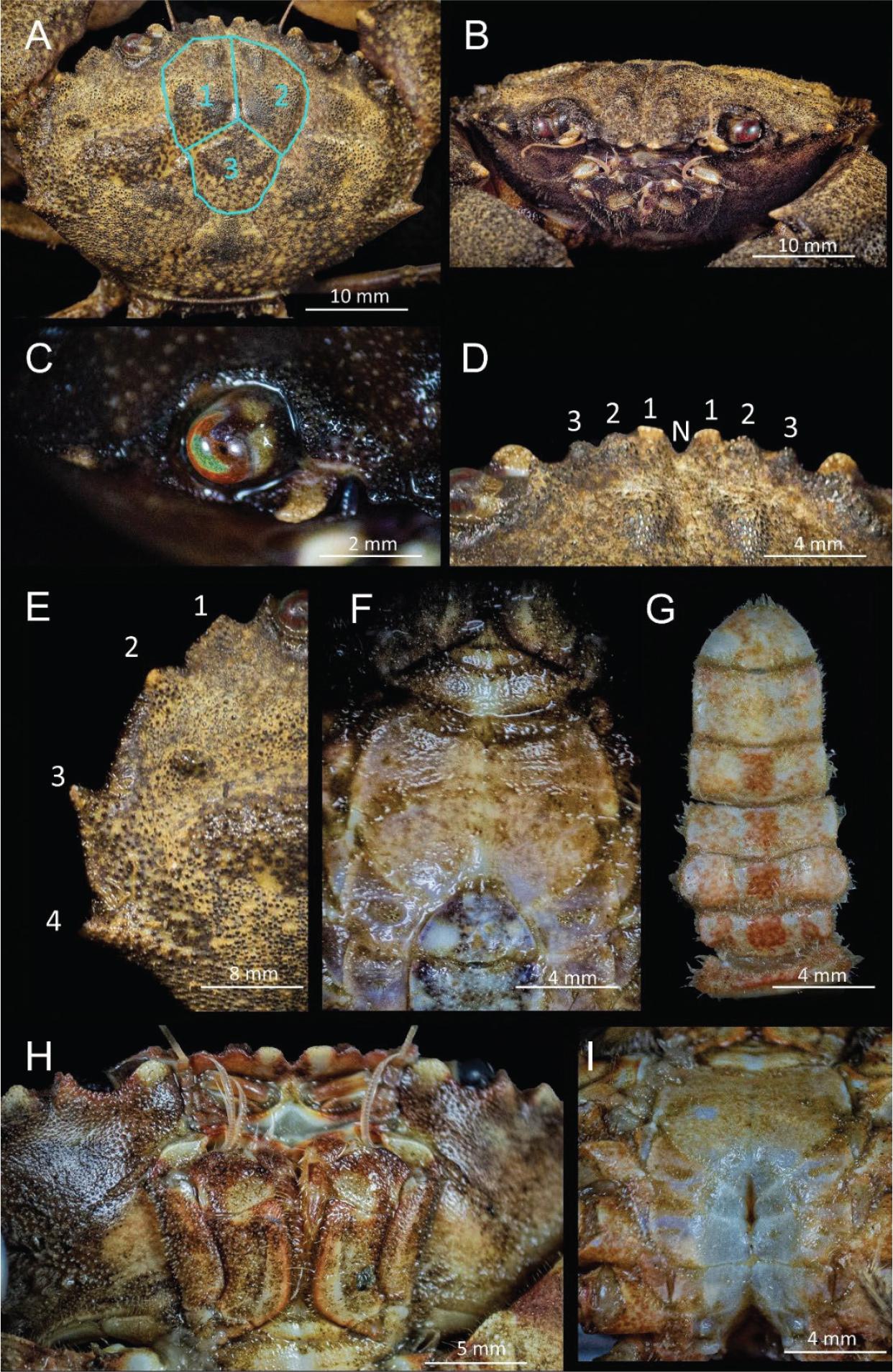 Carapace is dorsally granulated and is broader with a short length (CW/CL 1.33–1.36 times) (Table 1), appearing transversely ovate; the coloration is dirty brown to brownish yellow. The carapace regions are well defined, characterized by shallow depressions and adorned with numerous small granules. The cardiac region is distinctly separated from the gastric region; the gastric region is distinct and is subdivided into three portions—two anterolateral and one posterior (Fig. 3A). The surfaces of the two anterolateral gastric regions show a division into two slight, granule-covered convex lobes. The frontal margin is bilobed, separated from the orbit by a marked concavity, and the lobes are separated from each other by a median notch; each lobe possesses three teeth (Fig. 3D). The anterolateral margin is granular, thin, and sharp, and is rugose; it bears four broad lobiform crested teeth on each side. The first three teeth are broad and anteriorly acuminate, whereas the most posterior tooth is short and narrow (Fig. 3E). The orbits (Figs 3B and 3C) are wide, ovate, and closed internally; the eyes are large, filling the entire orbital cavity, and the corneas are pigmented green and ringed with red in life (Fig. 3C). The infraorbital margin is granular, and an exorbital tooth is present; the large internal lobe of the infraorbital margin extends slightly more forward than the third frontal tooth. The antennular fossae are subrectangular; the antennules are robust and fold transversely and obliquely; the antennary flagellum lies outside the orbital gap. The third maxilliped is large and fits tightly into the buccal cavity (Figs 3H and 4C);it is finely granular externally, and the inner and outer margins of the ischium and merus are sparsely setose. The merus of the third maxilliped is subquadrate, with the distolateral angle projecting and rounded; the ischium is subrectangular and about twice as long as the merus. The palps are thick and subcylindrical, and hairy tufts occur on the inner apical region of the carpus, propodus, and dactylus. The exopod is elongate and not tapering; its distal tip reaches three-quarters of the lateral margin of the merus, and the flagellum is long and well developed. The male thoracic sternum (Fig. 3F) is broad, with a smooth, lightly setose surface; a distinct suture separates the sternites. The abdomen is seven-segmented (Fig. 3G); the pleon is sparsely granulose and setose, with all somites and the telson freely articulating. The lateral margin is convex, and the telson is subtriangular, bluntly rounded distally, with the base as broad as it is wide. The female pleon (Fig. 4A) is much wider than that of the male; somite 3 is the widest in males, whereas somite 5 is the widest in females. The male first gonopod (G1) is stout, with the apical process gently curved; a fine line of setae is present distally along the margins (Figs 4F and 4G). The male second gonopod (G2) is elongate, subequal in length to the G1, and its distal segment is coiled inward (Fig. 4H). The vulvae in females are located 2–3 mm laterally on the sixth thoracic sternite and are ovate in outline (Fig. 4B). The chelipeds are massive and robust, slightly unequal, with the right chela larger in all specimens; males have proportionally larger and more robust chelipeds than females; the carpus is curved, and a small inner spine extends anteriorly from it. The digits are stout and black; the base of the dactylus of the larger chela bears a prominent molariform tooth (Fig. 4D). The dorsal surfaces of the carpus and palm of the chelipeds are granulose. The walking legs are slender; the margins of all legs are fringed with setae, with the thicker setae occurring on the propodus and dactylus.