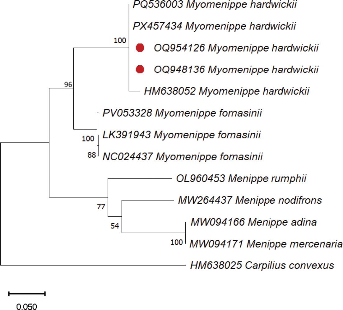| 2 | Myomenippe hardwickii PQ536003 (Malaysia) | 0.0000 | ||||||||||||
