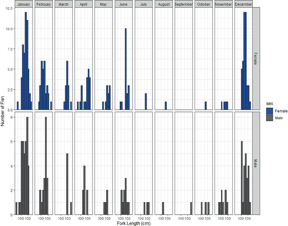 Lengths ranged from 60 to 175 cm FL for male specimens and from 72 to 177 cm FL for female specimens. The smallest species recorded was 43 cm FL and was caught in March 2019, but its sex was not reported. When length data were aggregated, male and female wahoo specimens could be observed throughout sampling months, except for September where no female was recorded (Fig. 3). The heaviest wahoo specimen weighing 49.5 kg WW was a male, while the heaviest female wahoo captured during this study weighed 41 kg WW. The overall sex ratio of our sample was 1.53:1 in favor of female wahoo. The sex ratio obtained in this study differed significantly from 1:1 (χ2 = 4.63, p = 0.041). No significant differences in size parameters were observed between sexes (permutation test, p > 0.05).