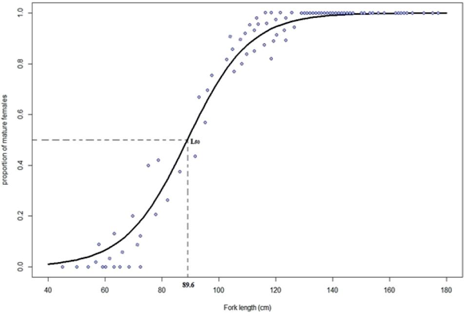 Mean length at 50% maturity was estimated for female wahoo collected in the Eastern Atlantic using a two-parameter logistic model: