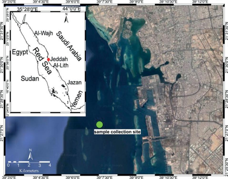 Five fish species, Lethrinus mahsena (sky emperor), Acanthurus gahhm (black surgeonfish), Siganus rivulatus (marbled spinefoot), Scarus ferrugineus (rusty parrotfish) and Hipposcarus harid (longnose parrotfish) were collected from the central Red Sea region of Saudi Arabia in December 2019. These fish species were selected based on their abundance at the sampling site. They are also marketed in the Jeddah fish market. The size (length), feeding behavior and habitat details of the fish collected during this study are presented in Table 1. Samples were collected by a fisherman using nets from the central Red Sea region (about 60 km south of Jeddah) of Saudi Arabia (21°27’22.5”N; 39°07’15.9”E; Figure 1). The collected samples were kept in an icebox and transported to the laboratory (approximate transport duration: 1 h). In the laboratory, the size of the fish was measured and three individuals of the same size group from each species were selected for heavy metal analysis. The whole fish samples were stored at –80°C until further analysis.