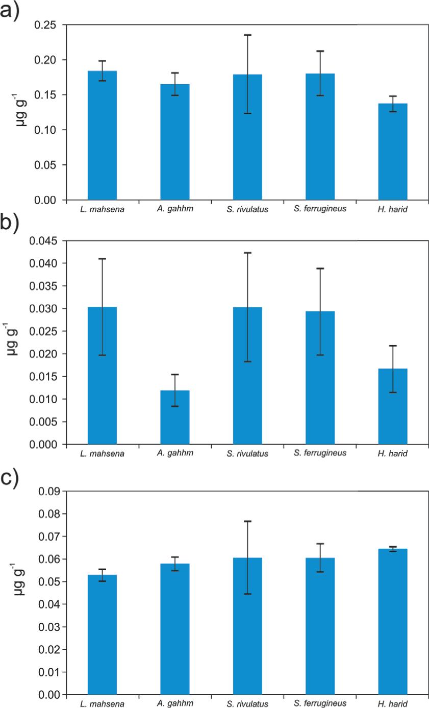 Lead concentration in fish muscle tissue showed a range between 0.016 and 0.030 μg g-1 ww (Figure 2). The highest value was recorded in L. mahsena and S. rivulatus. The value of 0.029 was recorded in the tissue of S. ferrugineus and 0.012 μg g-1 ww in A. gahhm tissue. The lowest value (0.016 μg g-1 ww) of lead in muscle tissues was determined for H. harid. The concentration of lead did not vary significantly among the five fish species (F = 2.94; df = 4, 10; P = 0.075, Table 2).