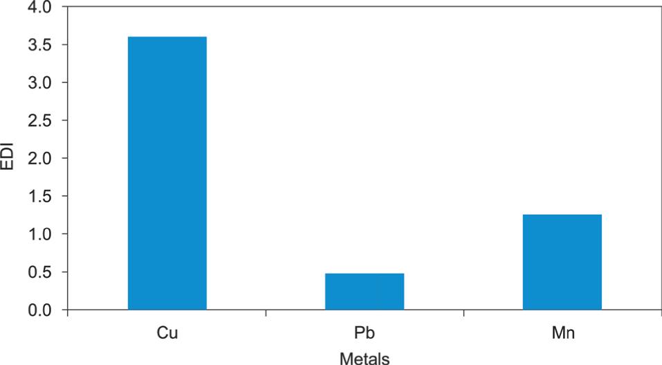 The estimated daily intake (EDI) value for lead was 0.49 μg day-1 ww. The calculated EDI for copper and manganese were 3.61 and 1.26 μg day-1 ww, respectively (Figure 3).