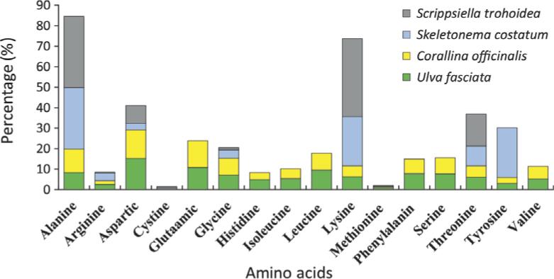 Amount (means) and relative % of amino acids in co-cultured Skeletonema costatum and Ulva fasciata_ Different letters indicate statistically significant differences between the treatments using Tukey’s test (– denotes not detected)_