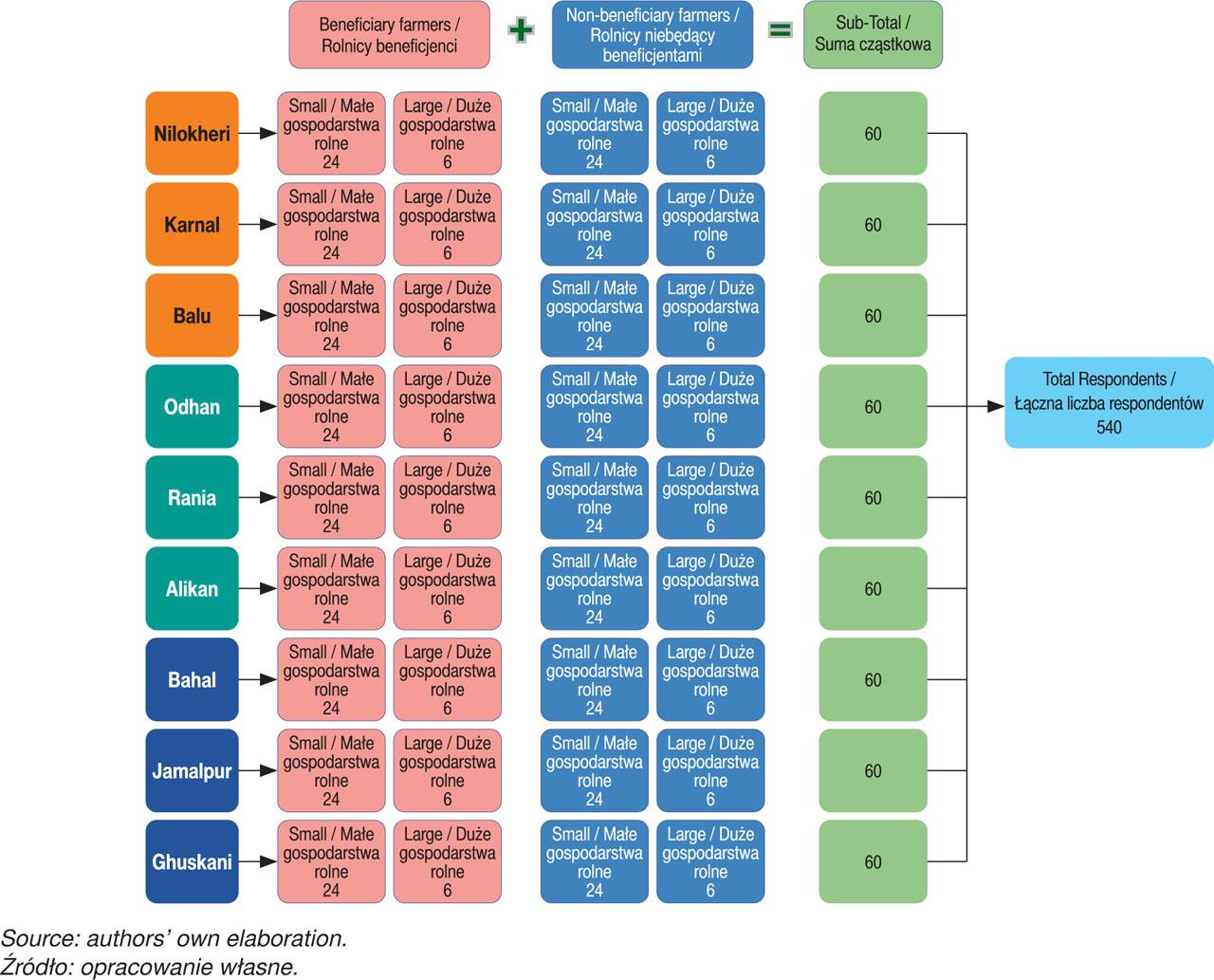 • Stage IV: Selection of Respondents: A sample of 540 farmers was chosen (270 beneficiaries, 270 non-beneficiaries) using proportionate random sampling. Farmers were classified into small (2) (80%) and large (3) (20%) categories. From each PACS, 30 beneficiaries (4) and 30 non-beneficiaries (5) farmers were selected. Each district included 180 respondents (90 beneficiaries, 90 non-beneficiaries).