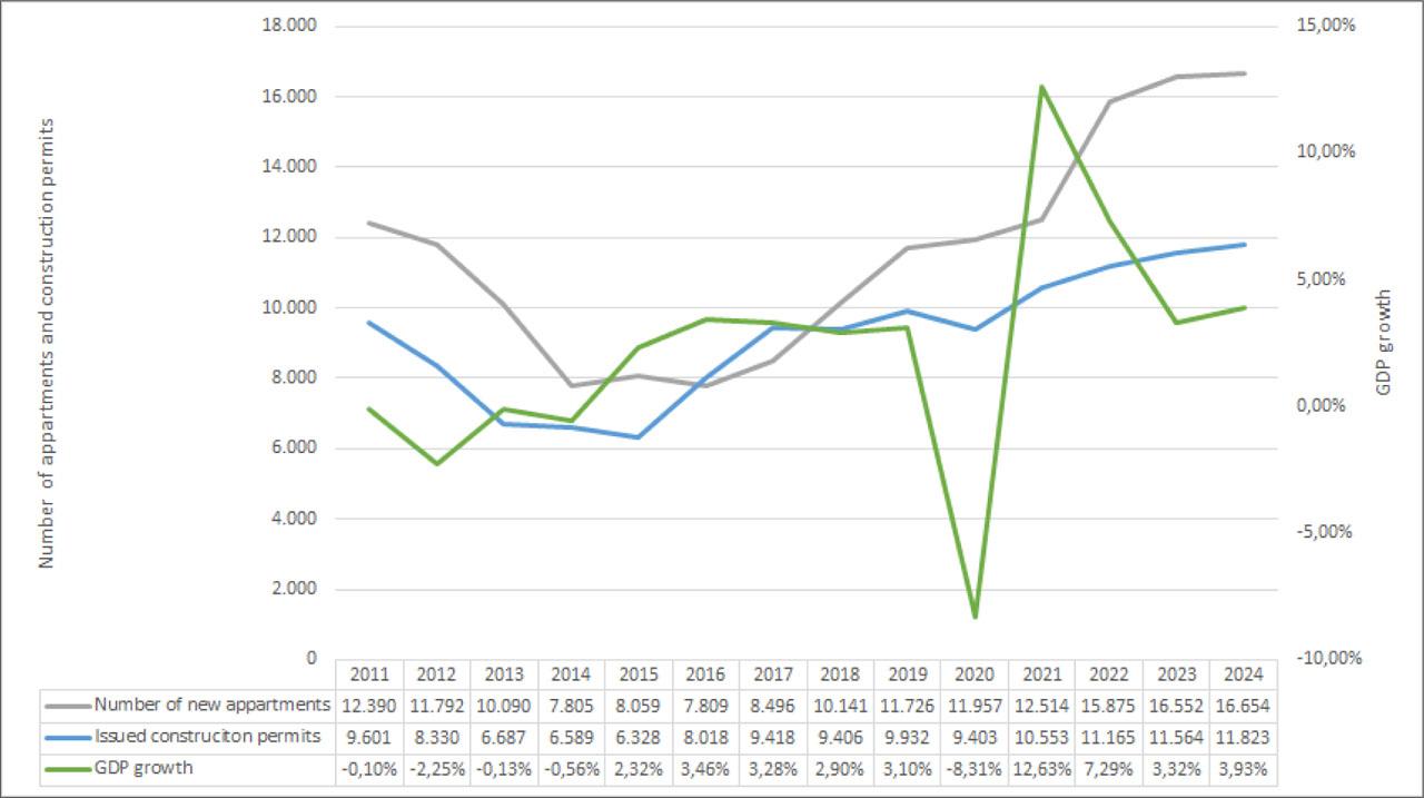 | GDP | New built apartments | New built square meters (000) | Average apartment price per square meter | Issued construction permits | Annual value of realised construction works (000 EUR) | |