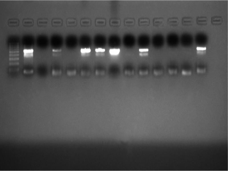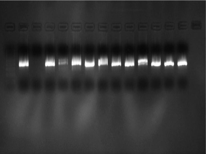 The samples were subjected to the pan-enterovirus specific nested PCR with outer primers where 530 bp products were amplified. Left to right, line 1: 100 bp marker, lines 2 to 5: HFM-2 to HFM-5, line 6: HFM-7, line 7: HFM-9, lines 8 to 14: HFM-10 to HFM-16.