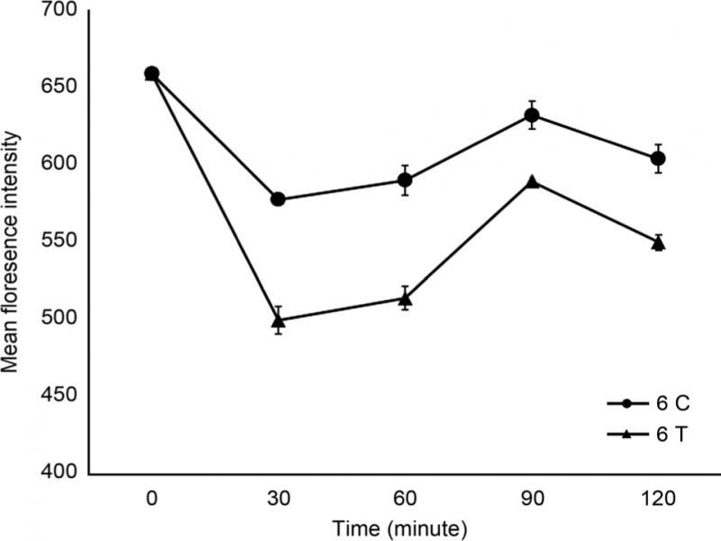 Rhodamine efflux assay. To illustrate the mechanism of amikacin sensitization to fluconazole, the efflux pump activity of two C. albicans isolates C6 and C21, as well as one C. glabrata, C8, was studied in the absence and presence of amikacin (4,000 μg/ml) using the rhodamine efflux assay (Fig. 1–3). Both C. albicans isolates, C6 and C21, showed a decline in the fluorescence intensity with percentages of reduction varying over time. The fluorescence intensity dropped promptly during the first 30 and 60 minutes of contact of isolate C6 with amikacin with percentages of reduction in the fluorescence intensity reaching 13.4 and 12.9%, respectively. After 90 and 120 minutes of treatment, those percentages began to decrease although still being considerable (Fig. 1). The pattern of fluorescence intensity reduction for isolate C21 displayed dissimilarity over time, where the effect of amikacin on the efflux pump activity for the first 30 minutes was weak resulting in a percentage of reduction of merely 3.7%. However, a time-gradient remarkable effect was established and percentages of reduction in the fluorescence intensity reached 7.3, 8.5, and 8.9% at 60, 90, and 120 minutes, respectively (Fig. 3). The isolate of C. glabrata, C8, didn’t show any prominent decrease in the fluorescence intensity for the amikacin-treated cells when compared to the control where the percentages of reduction in the fluorescence intensity over the tested time intervals ranged from 0.4 to 1.5% (Fig. 3).