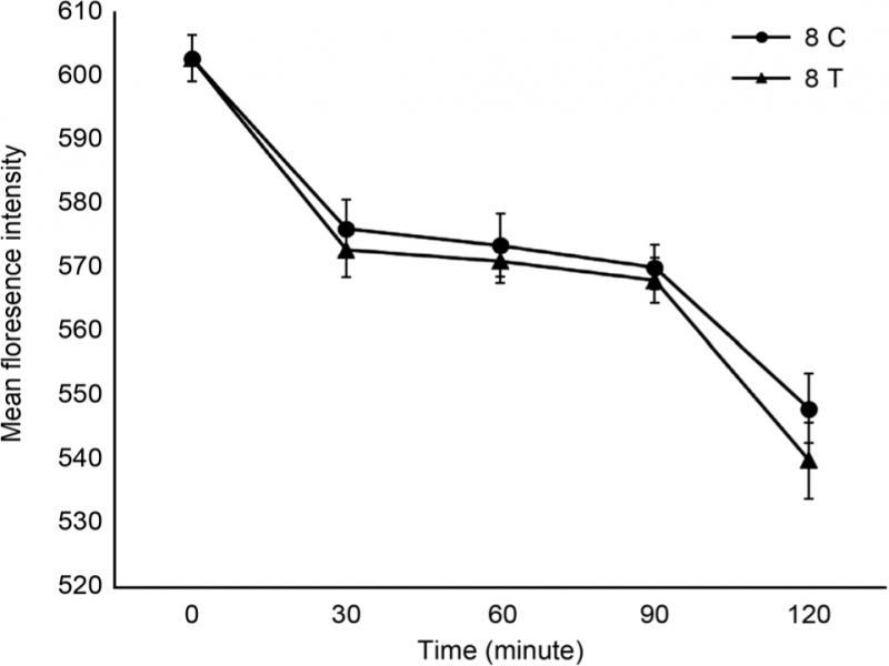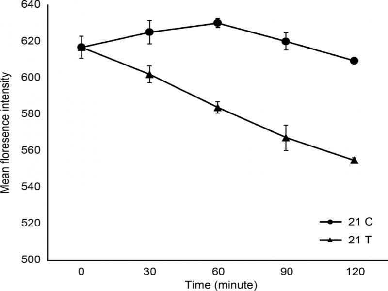 Comparing the effect of amikacin (4,000 μg/ml) on the efflux of rhodamine among the three tested isolates C6, C8, and C21 after 120 minutes of treatment, a statistically significant effect (p-value < 0.05) was observed for C6 and C21 with percentage of reduction in the fluorescence intensity of 8.9% for both isolates. However, the effect of amikacin treatment was statistically non-significant (p-value > 0.05) for isolate C8 where the percentage of reduction in the fluorescence intensity reached hardly 1.5% after 120 minutes of treatment (Fig. 4).