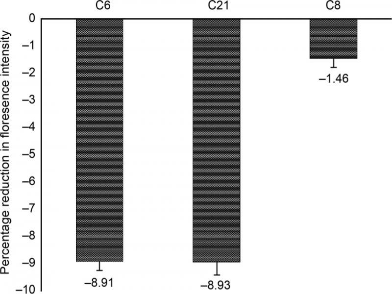 Percentage of reduction in the rhodamine fluorescence intensity after 120 minutes of amikacin (4,000 μg/ml) treatment of C6, C21 and C8 Candida isolates.