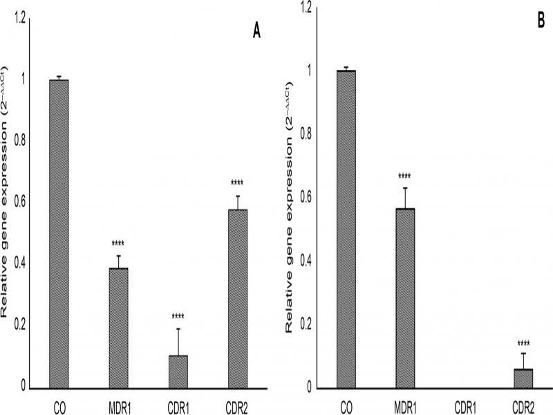 The levels of the expression of each of the MDR1, CDR1 and CDR2 genes were normalized to the expression level of the house keeping gene ACT1 and compared to the corresponding expression levels in the control untreated isolates. For the calculation of the transcripts of each of the target genes, the Pfaffl method or ΔΔCt method was applied (Pfaffl 2001).