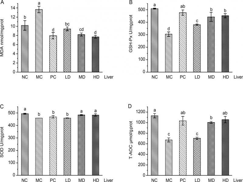 Effect of L. fermentum JX306 on GSH-Px, SOD, T-AOC activities, and MDA concentration in the liver of mice with oxidative stress induced by D-galactose. (A) MDA; (B) GSH-Px; (C) SOD; (D) T-AOC. All data are presented as mean ± SD (n = 3). Bars with different letters were significantly different (p < 0.05).