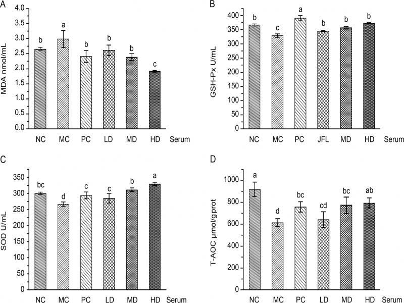 Effect of L. fermentum JX306 on GSH-Px, SOD, T-AOC activities and MDA concentration in the serum of mice with oxidative stress induced by D-galactose. (A) MDA; (B) GSH-Px; (C) SOD; (D) T-AOC. All data are presented as mean ± SD (n = 3). Bars with different letters were significantly different (p < 0.05).