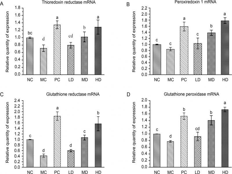 Effect of L. fermentum JX306 on the expression of the genes encoding for peroxiredoxin-1 (Prdx1), glutathione peroxidase (Gsr), glutathione peroxidase (Gpx), and thioredoxin reductase (TR3) in the liver of D-galactose induced aging mice. (A) Thioredoxin reductase mRNA; (B) Peroxiredoxin1 mRNA; (C) Glutathione reductase mRNA; (D) Glutathione peroxidase mRNA. All data are presented as mean ± SD (n = 3). Bars with different letters were significantly different (p < 0.05).