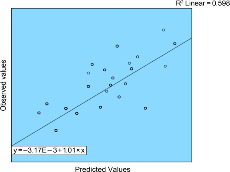 The Hosmer-Lemeshow test was chosen to test the goodness of fit for the logistic regression model since it contained more than one continuous variable. It showed a good fit of the regression model performed (Chi = 0.41, p = 0.995). Additionally, the classification table was made to see how successful the model is in predicting the severe dengue cases, as presented in detail in Table III. Moreover, we have calculated the predicted value and plotted it versus observed ones, as demonstrated in Fig. 2 It showed the success of the model in predicting with most cases around the mean prediction line in close conjugation with observed ones.