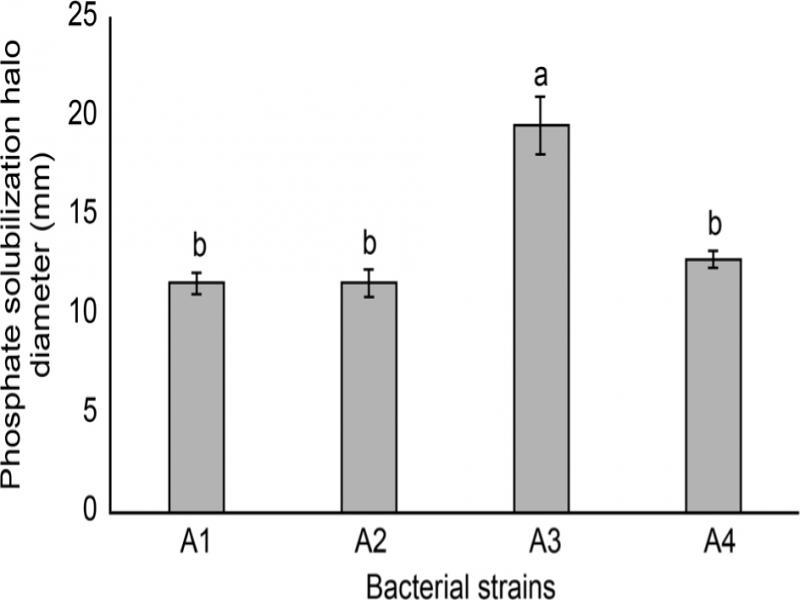 In this paper, four out of sixteen bacterial strains from potato crop soil were screened and isolated. These four bacterial strains formed halos as evidence of P solubilization in PVK agar with tricalcium phosphate as non-soluble P source. Strain A3 had the highest halo diameter (20 mm) (Fig. 1). According to Paul and Sinha (2017), the use of PVK agar as a medium for qualitative estimation of P solubilization is considered the first step for screening and isolating PSB. Their paper reported a 13 mm halo diameter with the P-solubilizing strain of Pseudomonas aeruginosa.