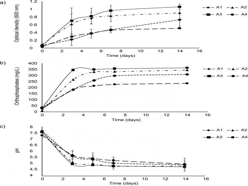 a) the bacterial growth measured as optical density at a wavelength of 600 nm, b) the orthophosphates released measured with molybdenum blue method, and c) the acidification evidence (lower pH values) in PVK liquid medium. The lines shown above or below each point indicate the standard deviation.